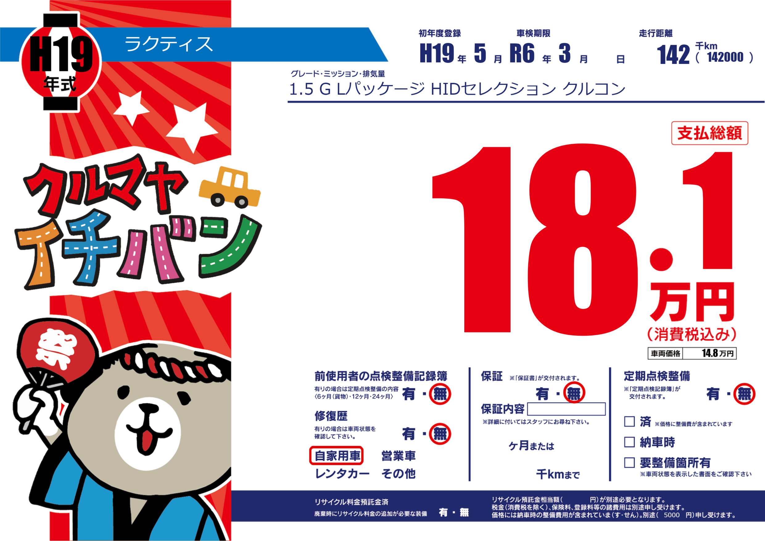 | 車名 | ラクティス | グレード ミッション 排気量 |
