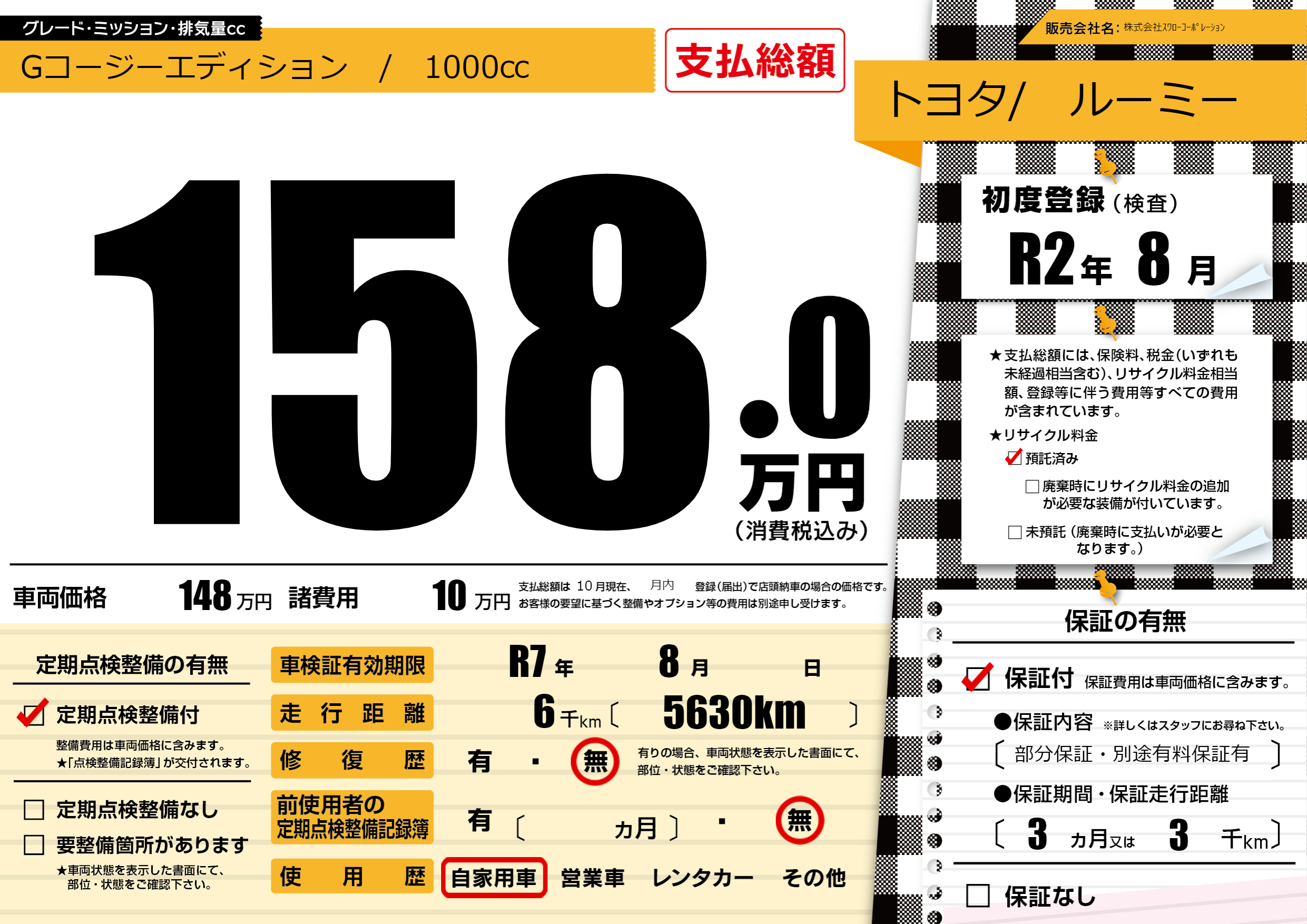 | 走行キロ | 0.6万km | 初年度登録 | R2年8月 |