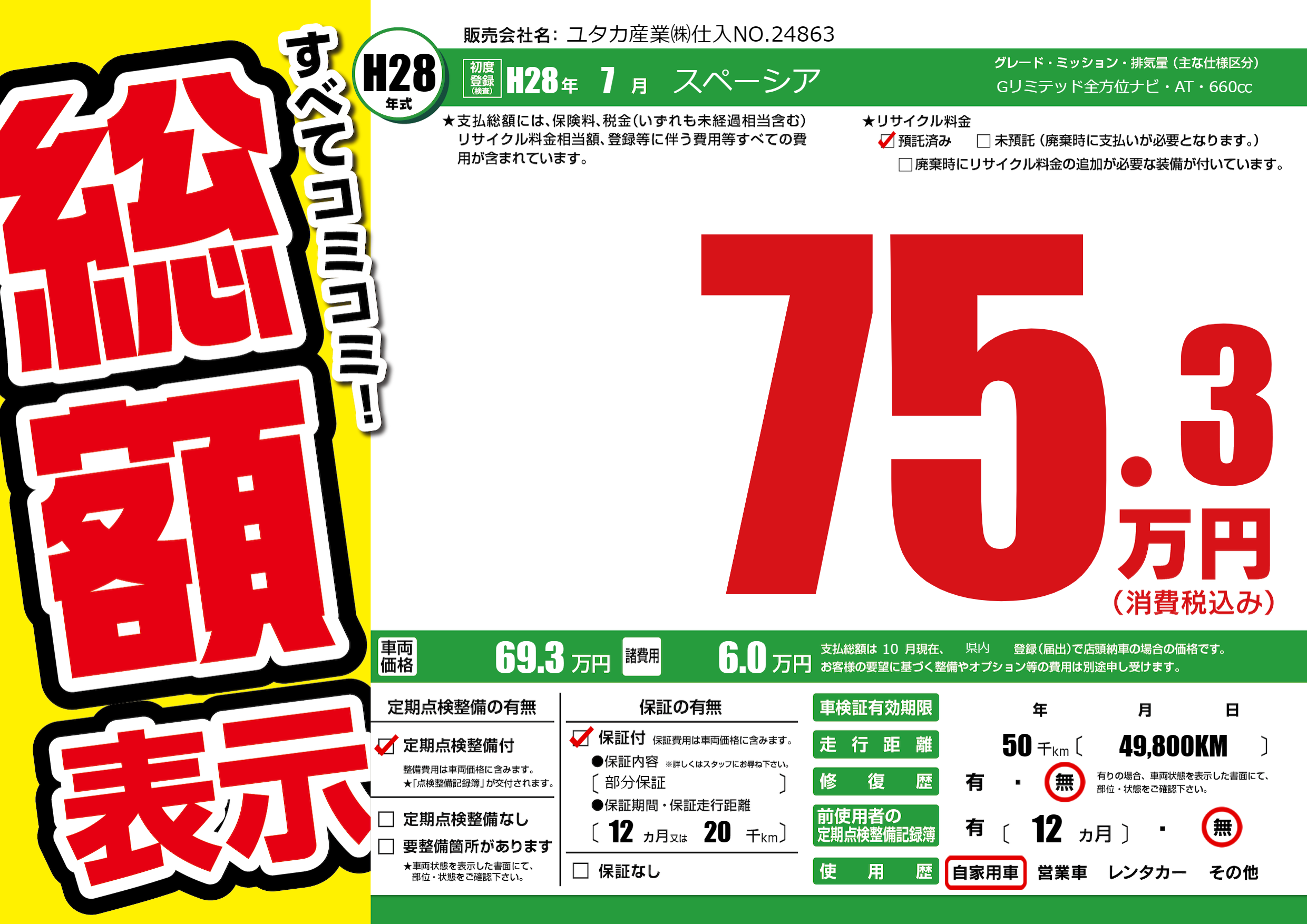 | 走行キロ | 5万km | 初年度登録 | H28年7月 |