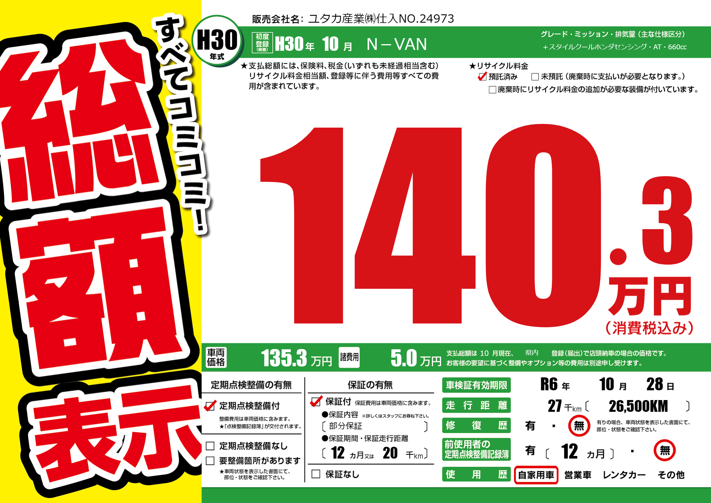| 車名 | N-VAN | グレード ミッション 排気量 |