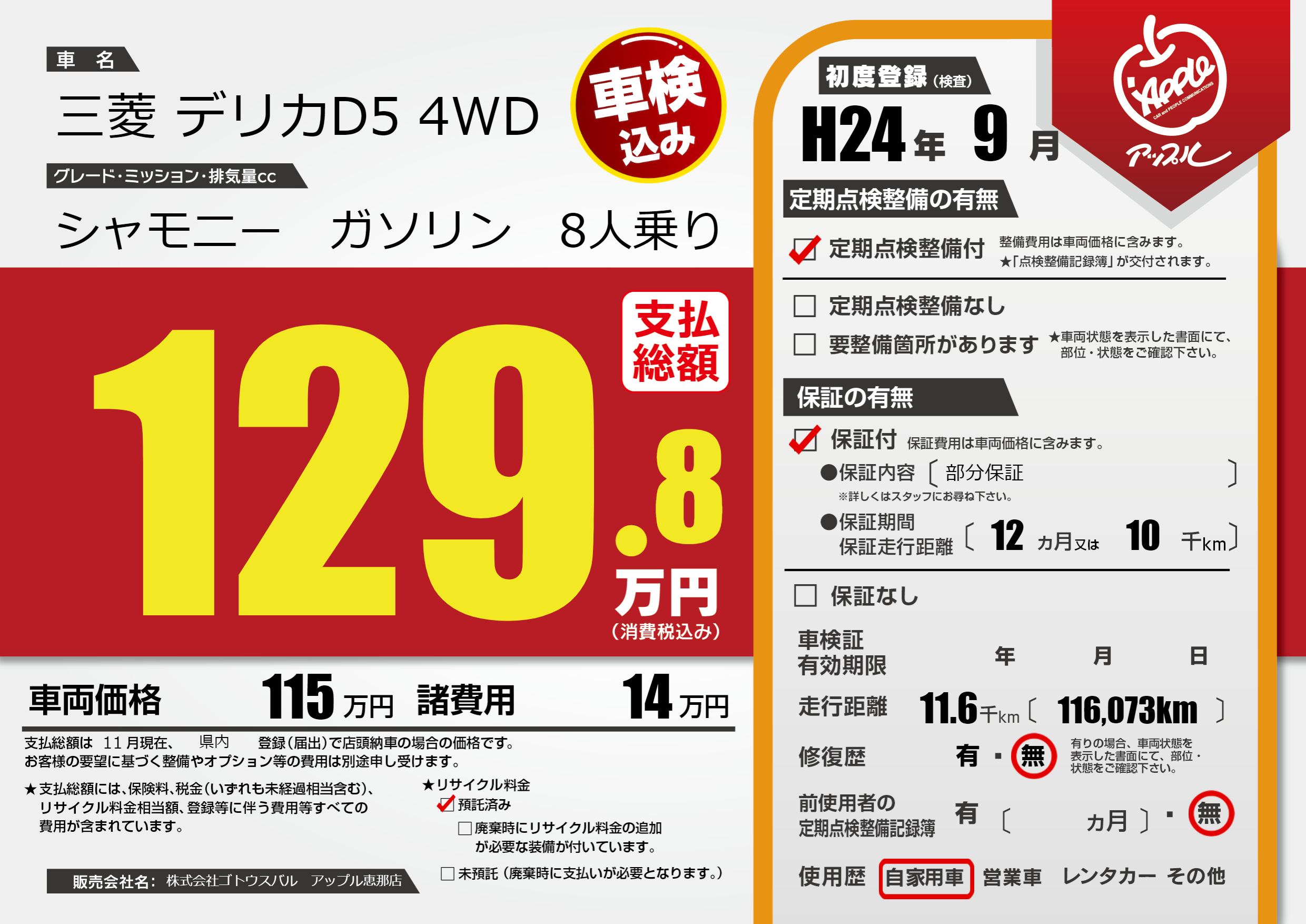 保証付き 保証内容(部分保証) 12ヶ月または(10)千kmまで |