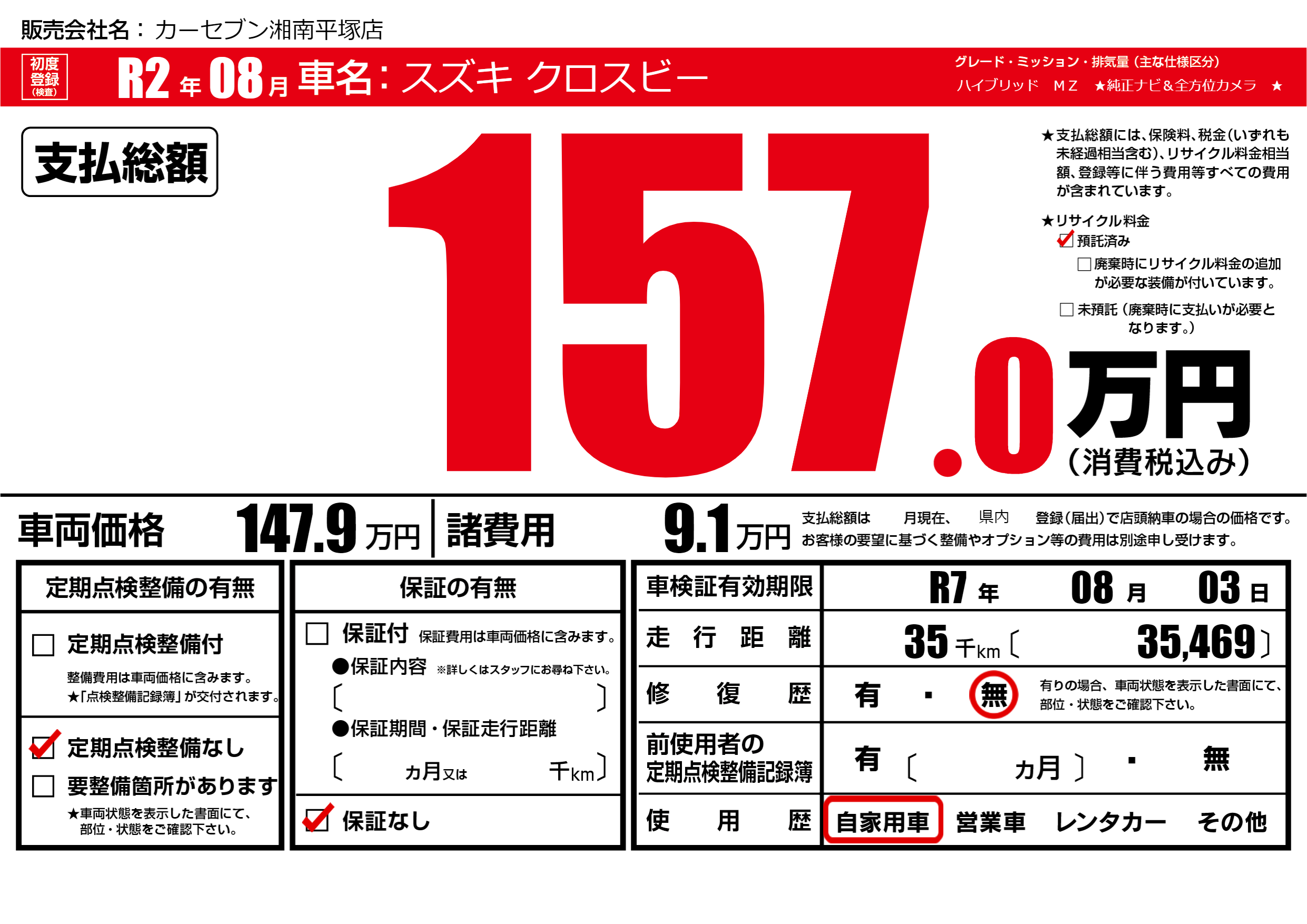 | 車名 | スズキ クロスビー | グレード ミッション 排気量 |