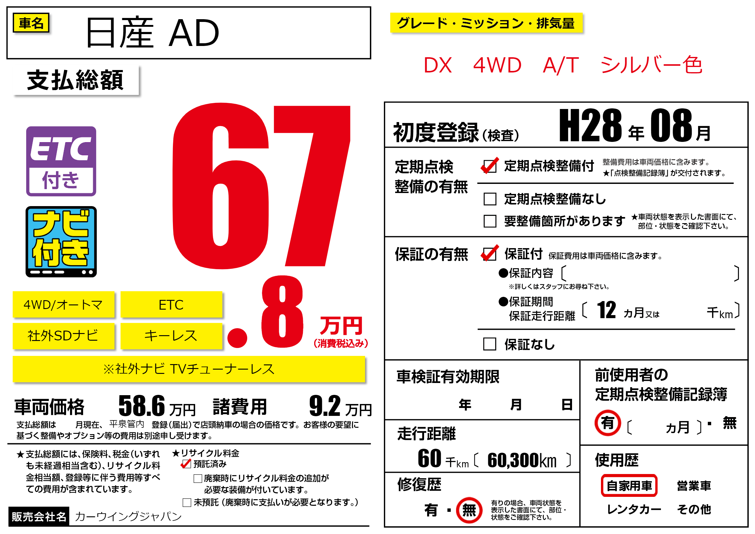 | 車名 | 日産 AD | グレード ミッション 排気量 |