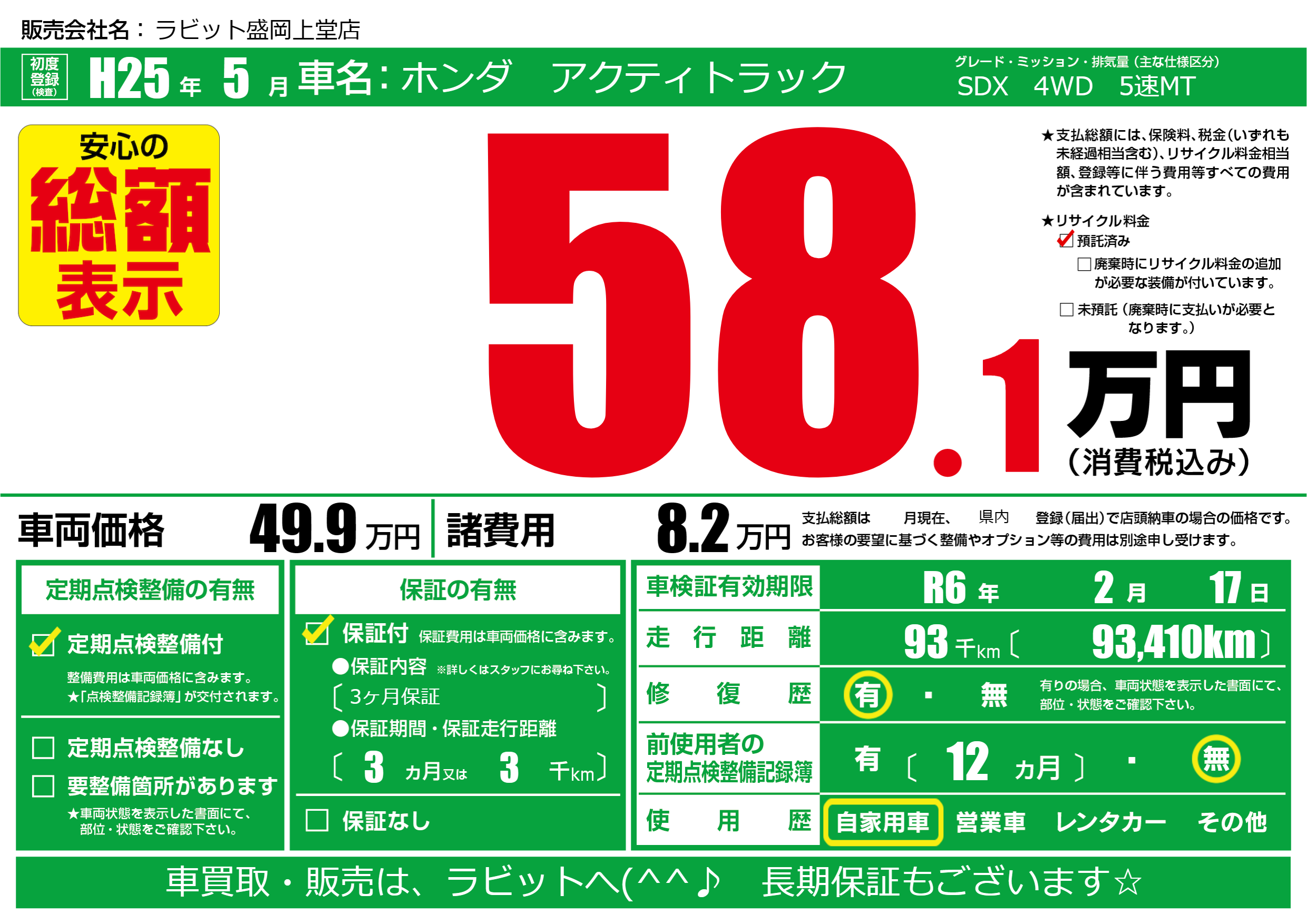 | 走行キロ | 9.3万km | 初年度登録 | H25年5月 |