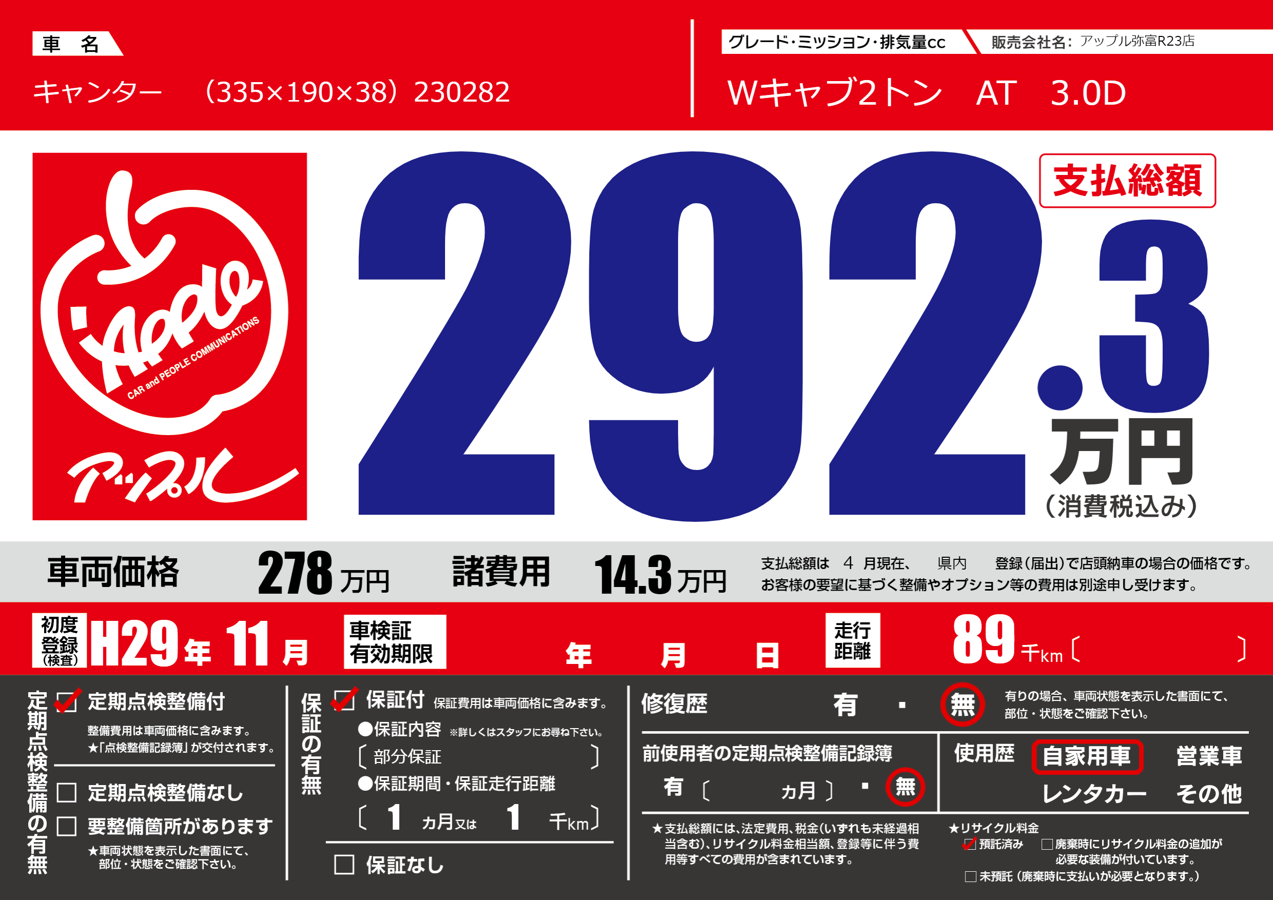 | 車名 | キャンター (335×190×38)230282 | グレード ミッション 排気量 |