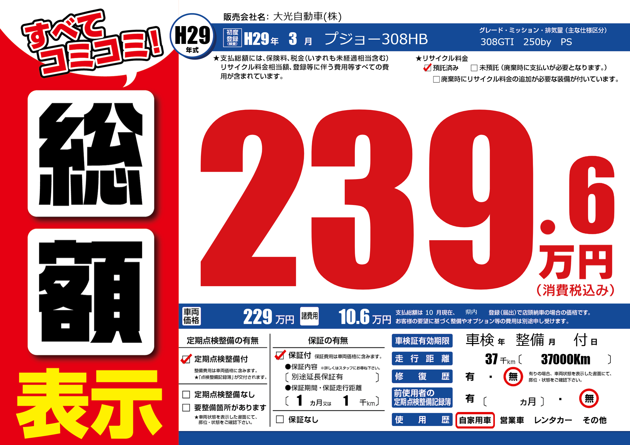 | 車名 | プジョー308HB | グレード ミッション 排気量 |