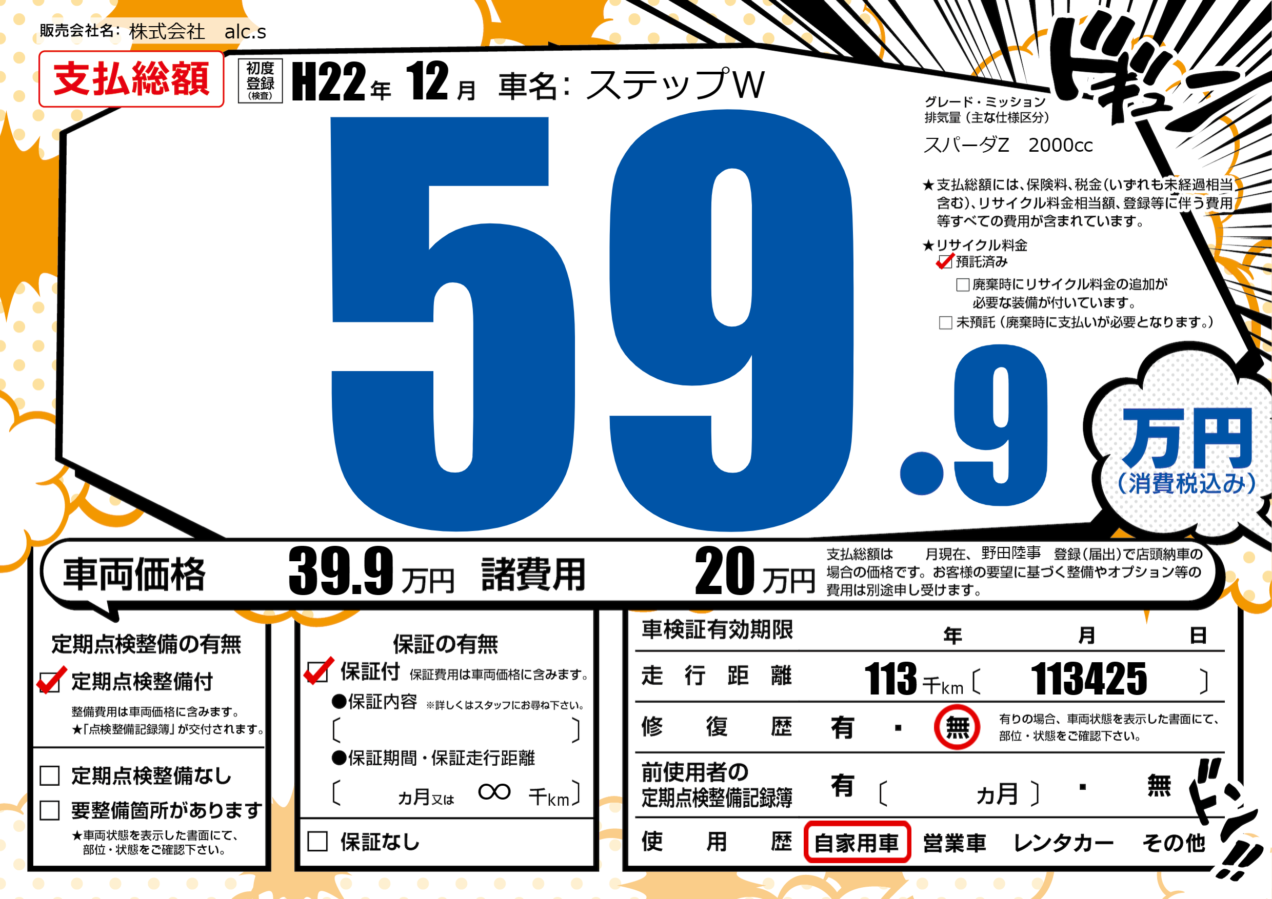 | 走行キロ | 11.3万km | 初年度登録 | H22年12月 |