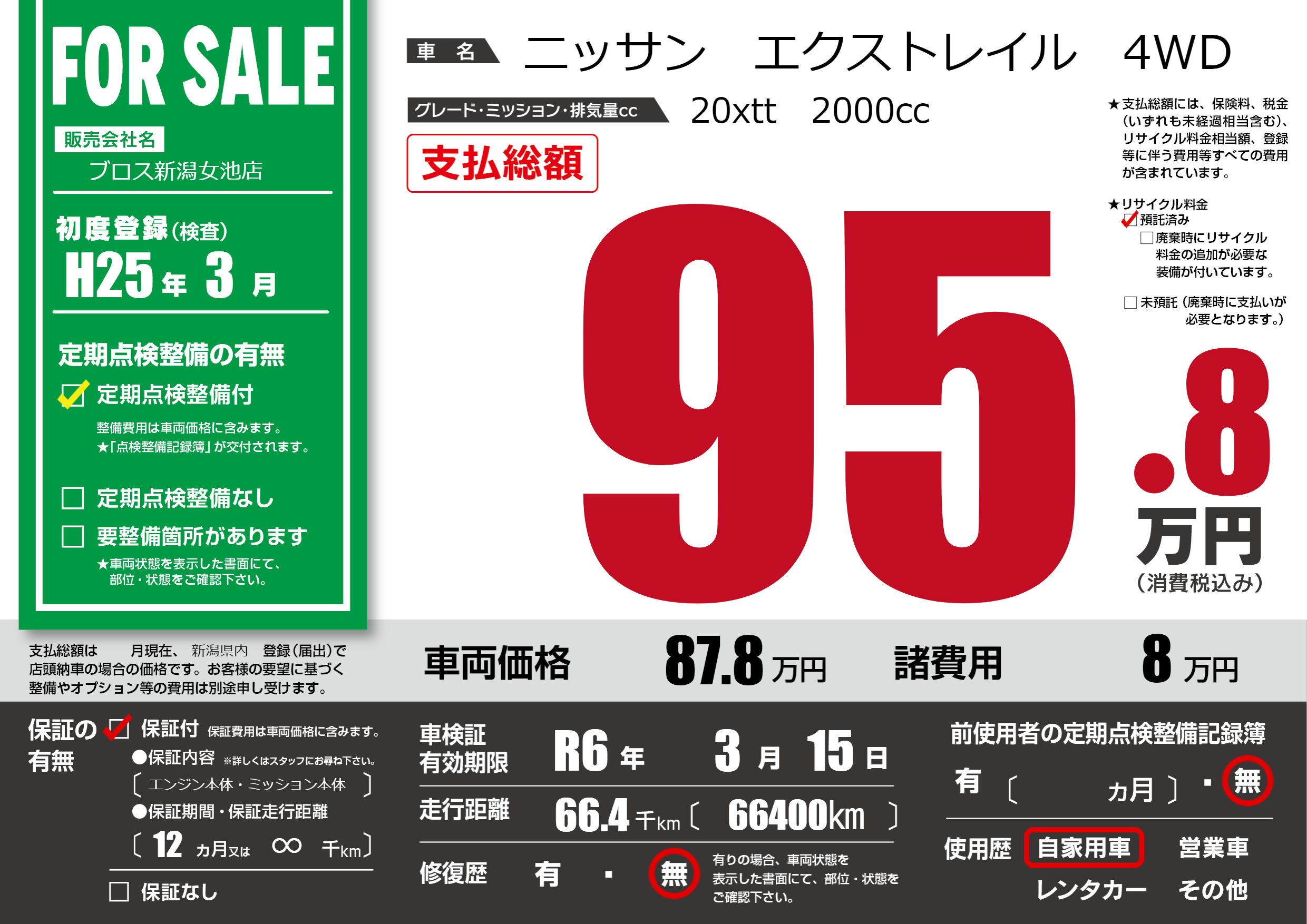 | 車名 | ニッサン エクストレイル 4WD | グレード ミッション 排気量 |