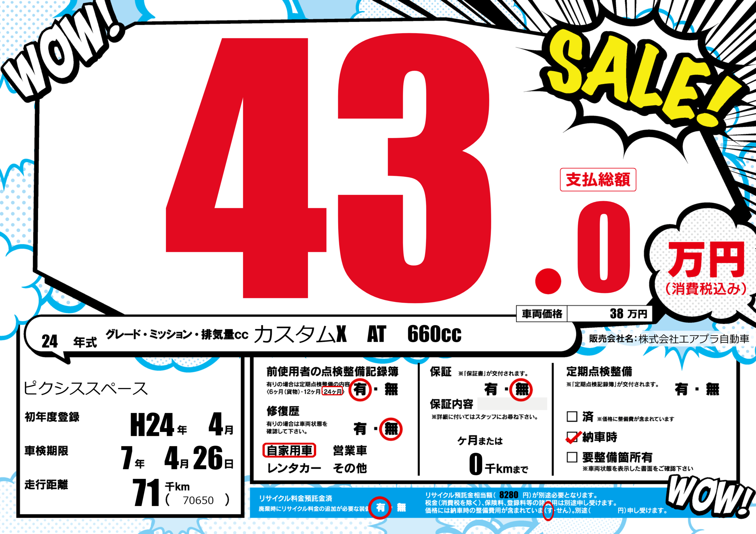| 走行キロ | 7.1万km | 初年度登録 | H24年4月 |