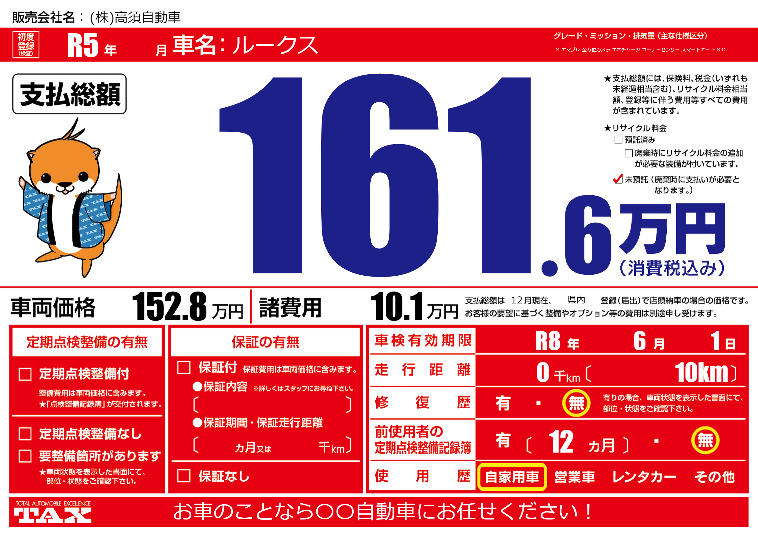 なし | リサイクル預託金相当額 | ( 0円)が別途必要 |