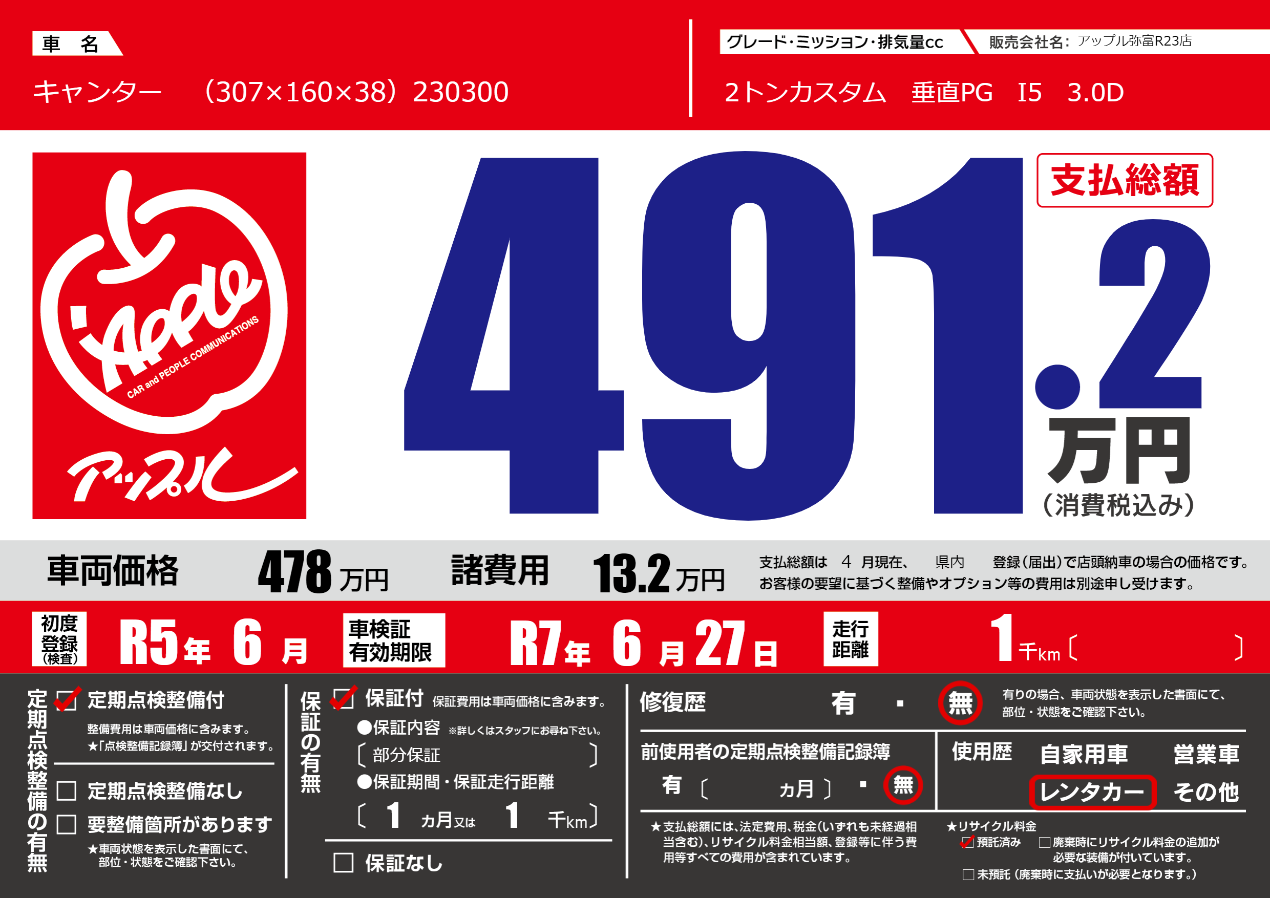 | 車名 | キャンター (307×160×38)230300 | グレード ミッション 排気量 |
