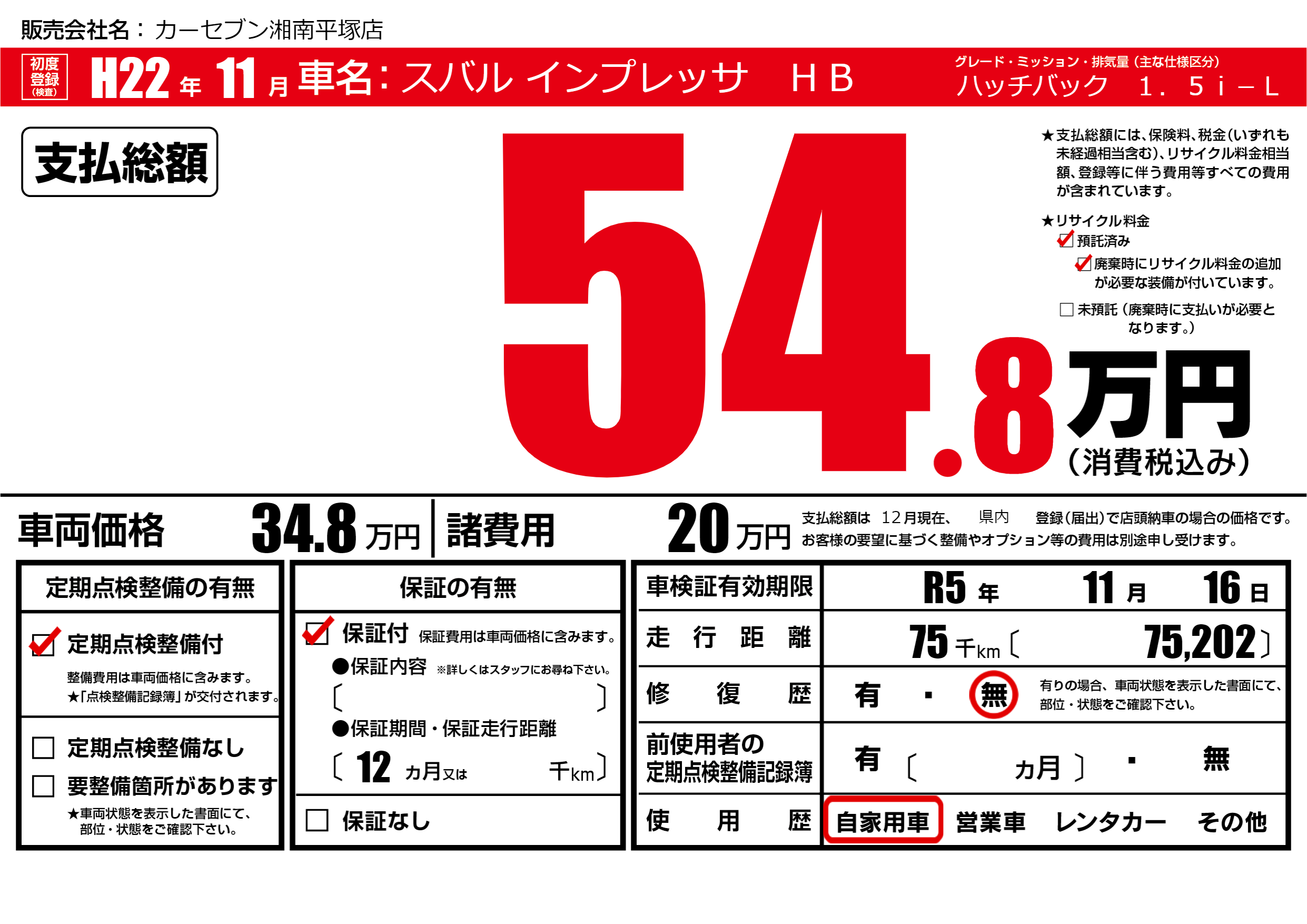 | 車名 | スバル インプレッサ HB | グレード ミッション 排気量 |