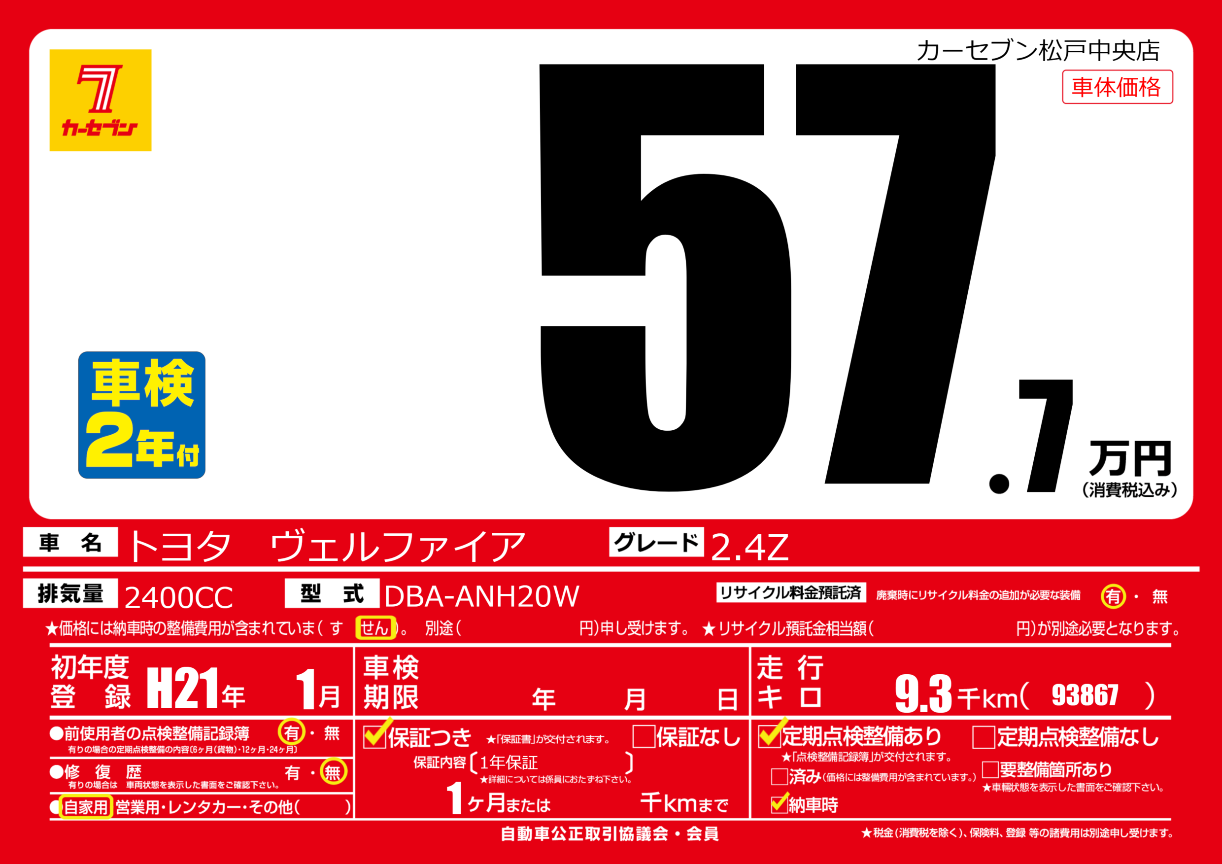 | 車名 | トヨタ ヴェルファイア | グレード ミッション 排気量 |