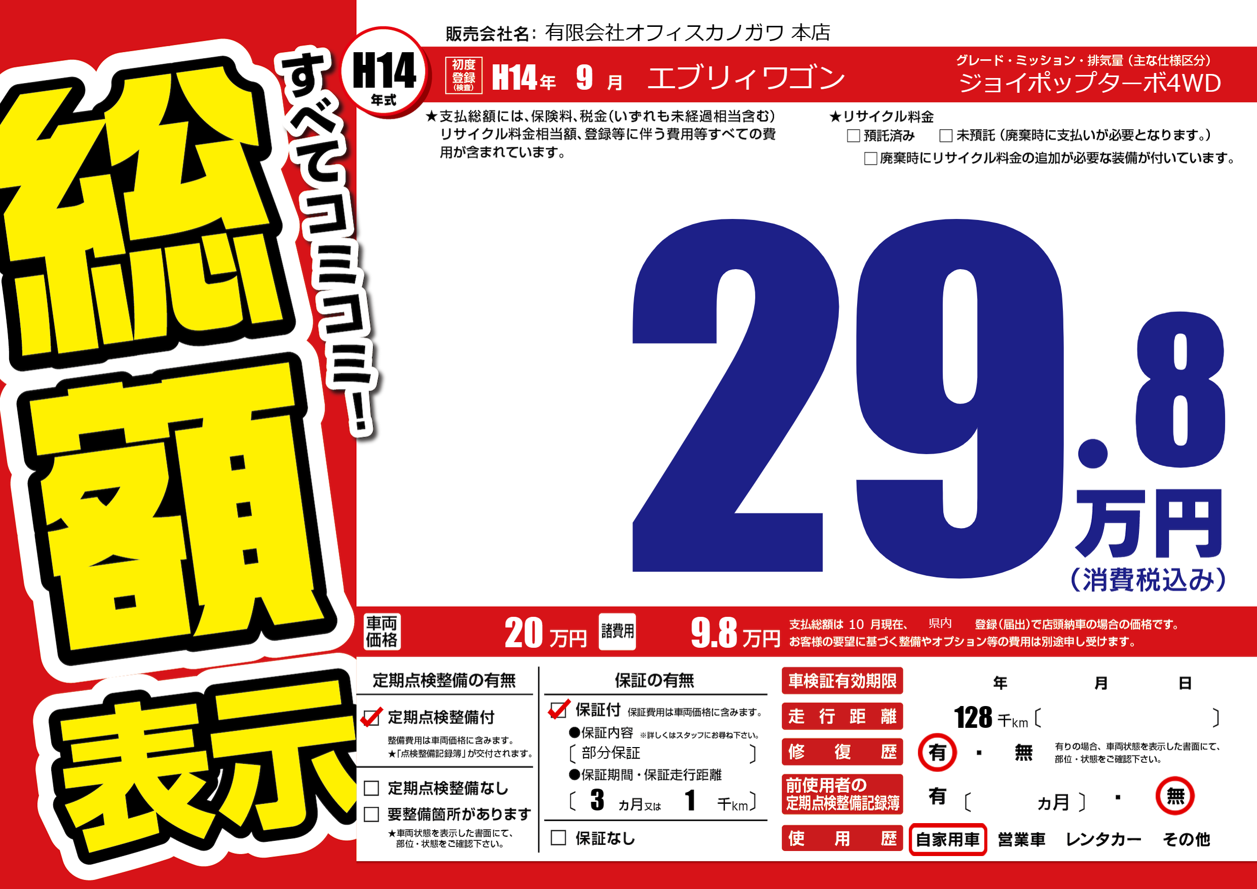 | 走行キロ | 12.8万km | 初年度登録 | H14年9月 |