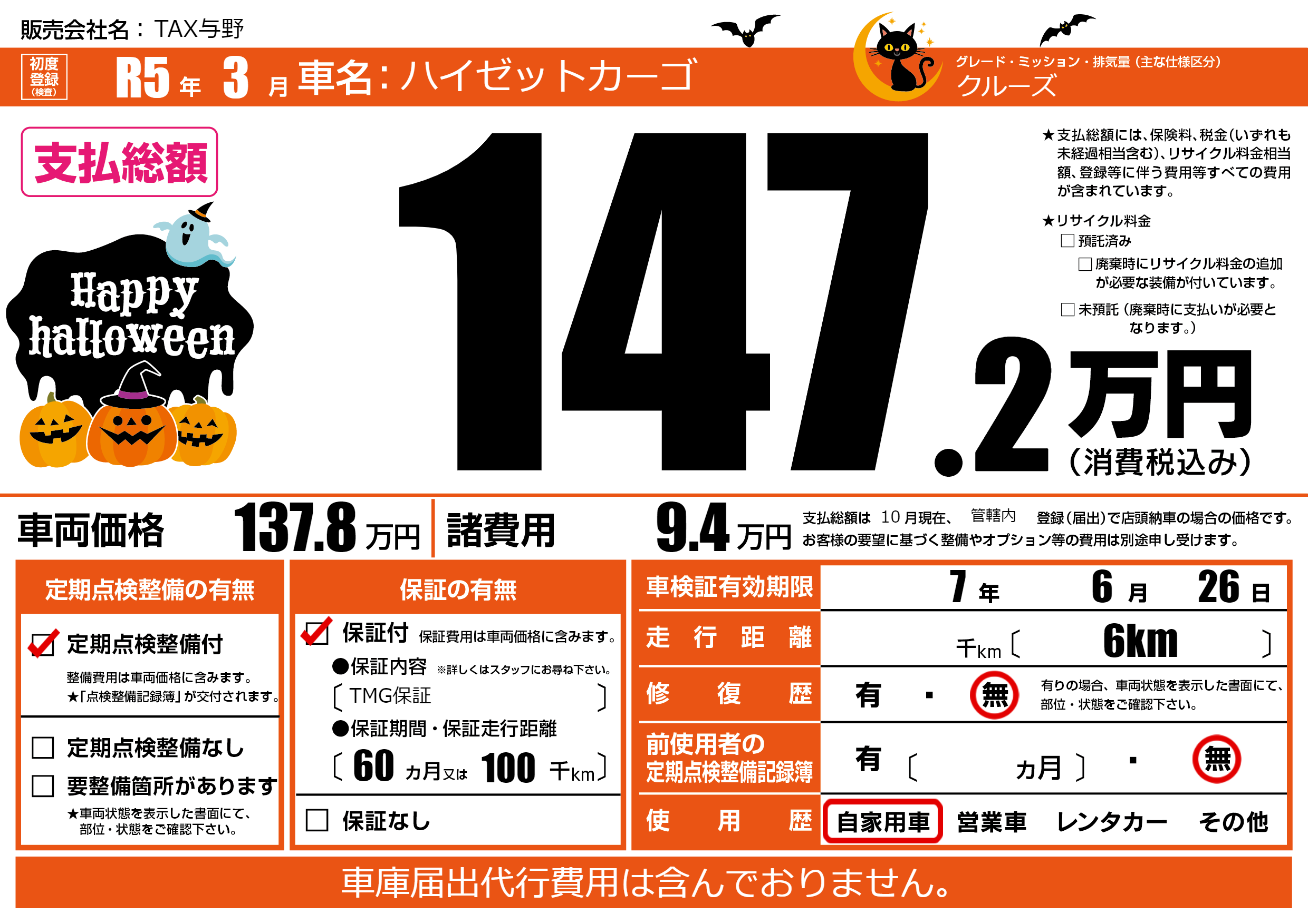保証付き 保証内容(TMG保証) 60ヶ月または(100)千kmまで |