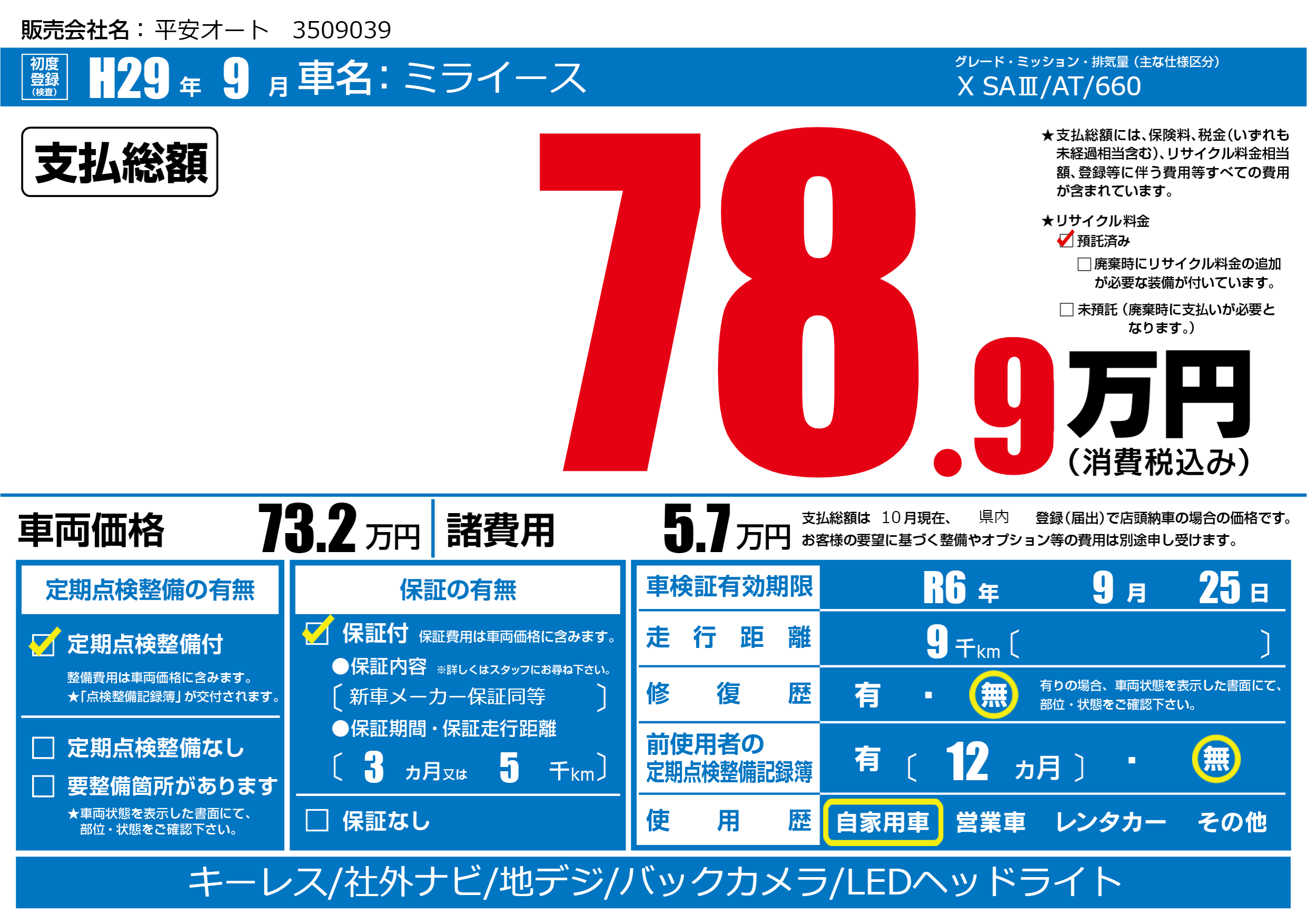 | 走行キロ | 0.9万km | 初年度登録 | H29年9月 |
