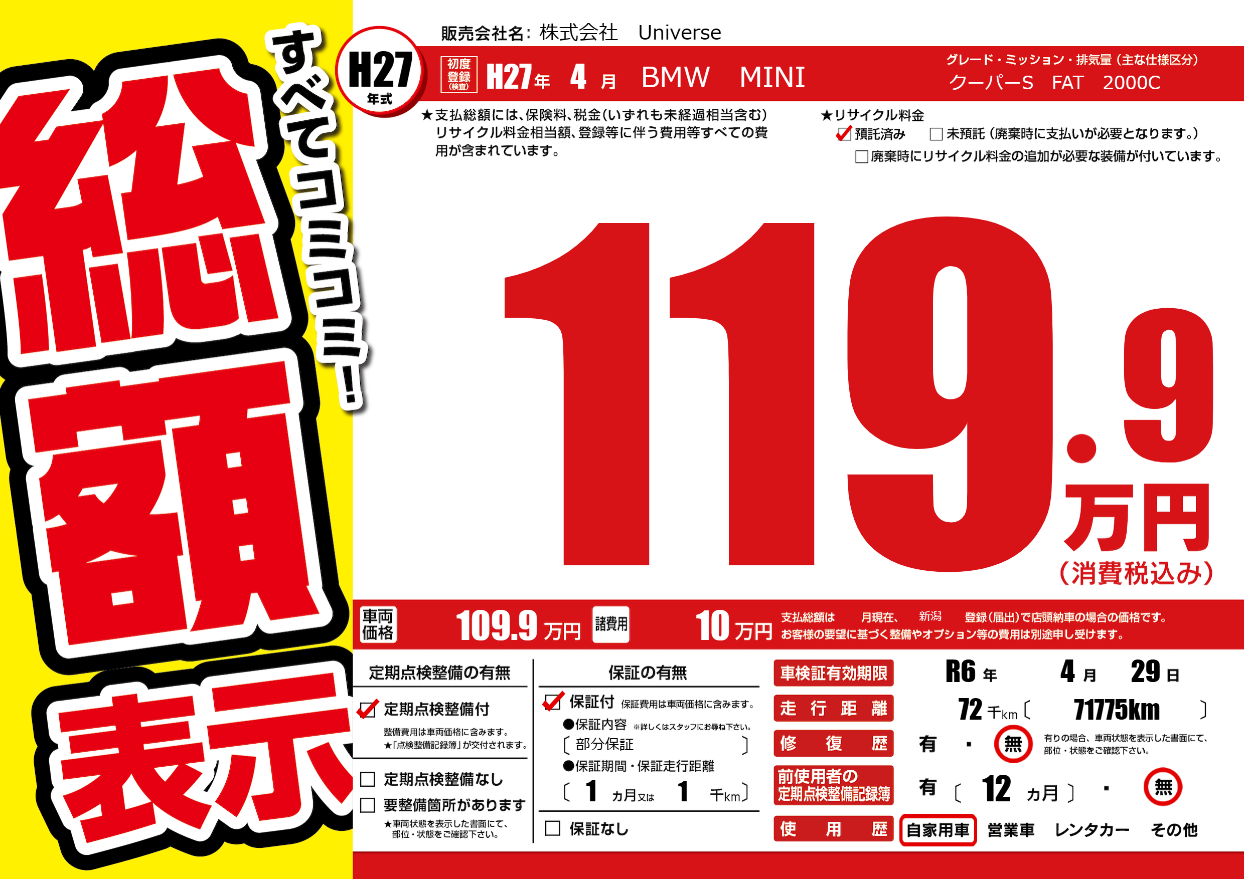 | 車名 | BMW MINI | グレード ミッション 排気量 |
