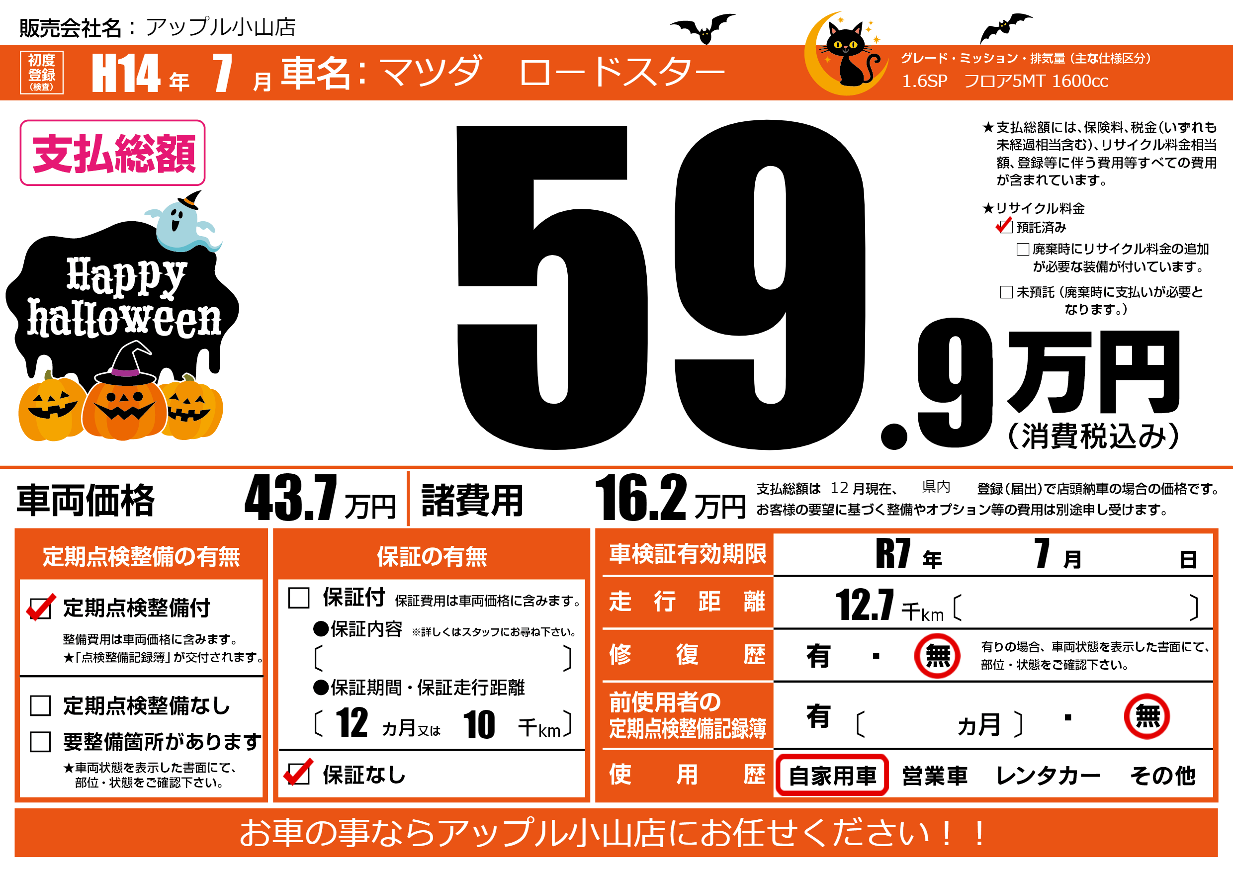 | 走行キロ | 1.2万km | 初年度登録 | H14年7月 |