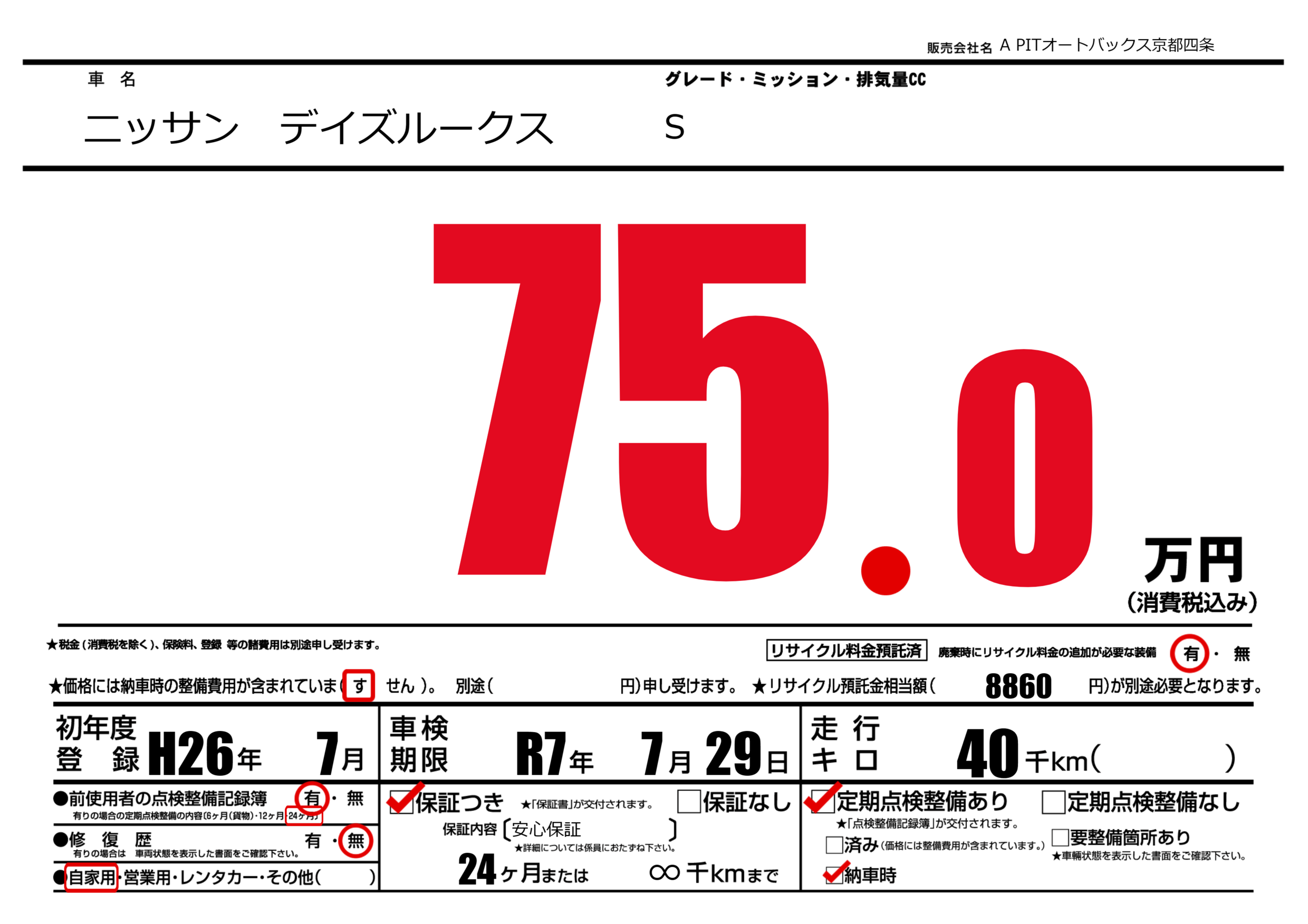 | 走行キロ | 4万km | 初年度登録 | H26年7月 |