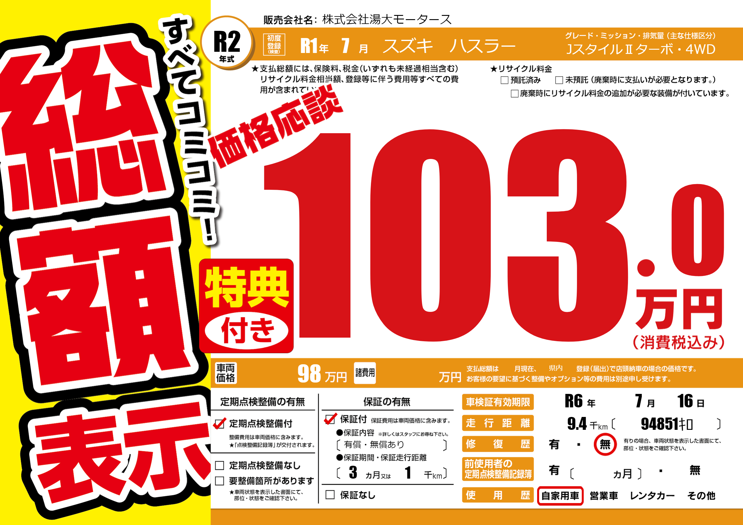| 車名 | スズキ ハスラー | グレード ミッション 排気量 |