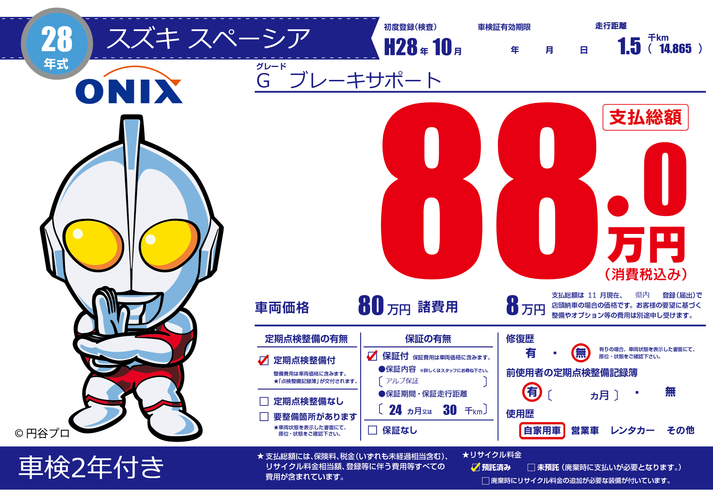 | 車名 | スズキ スペーシア | グレード ミッション 排気量 |
