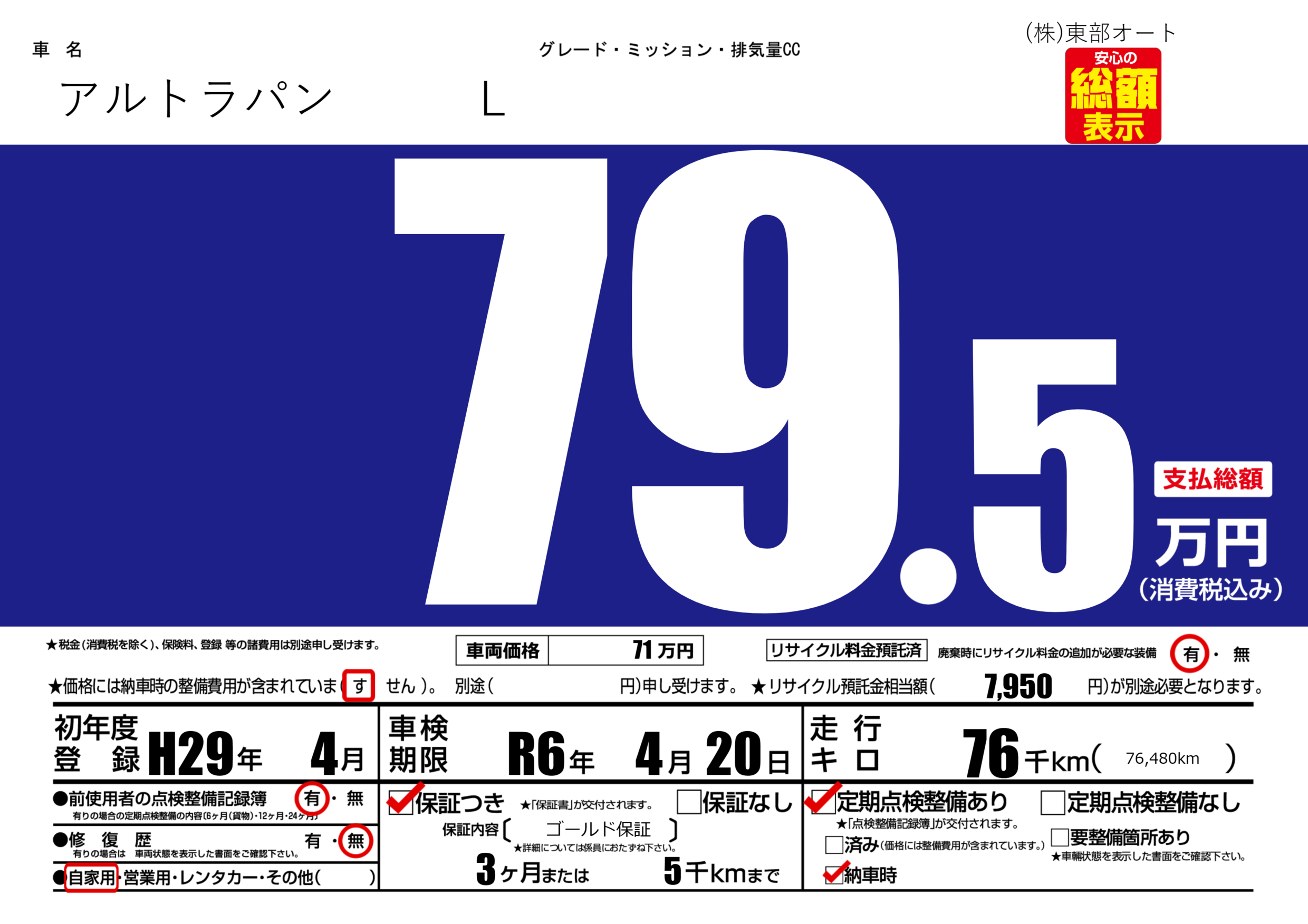| 定期点検整備 | 定期点検整備あり 納車時あり | ||
