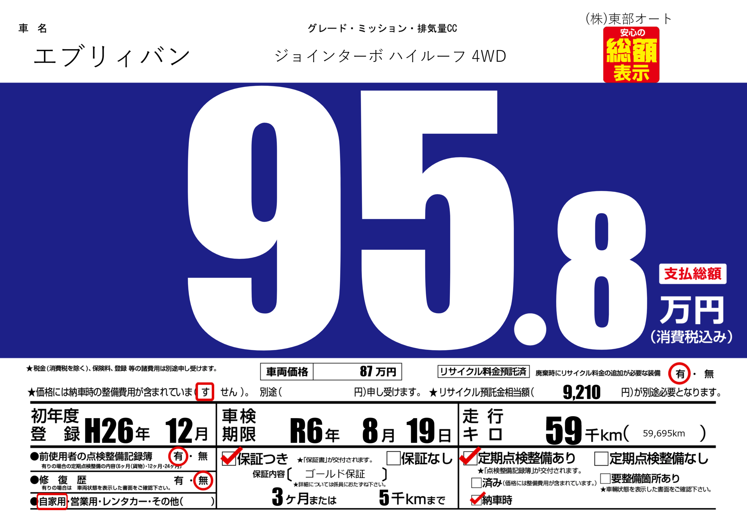 | 車名 | エブリィバン | グレード ミッション 排気量 |
