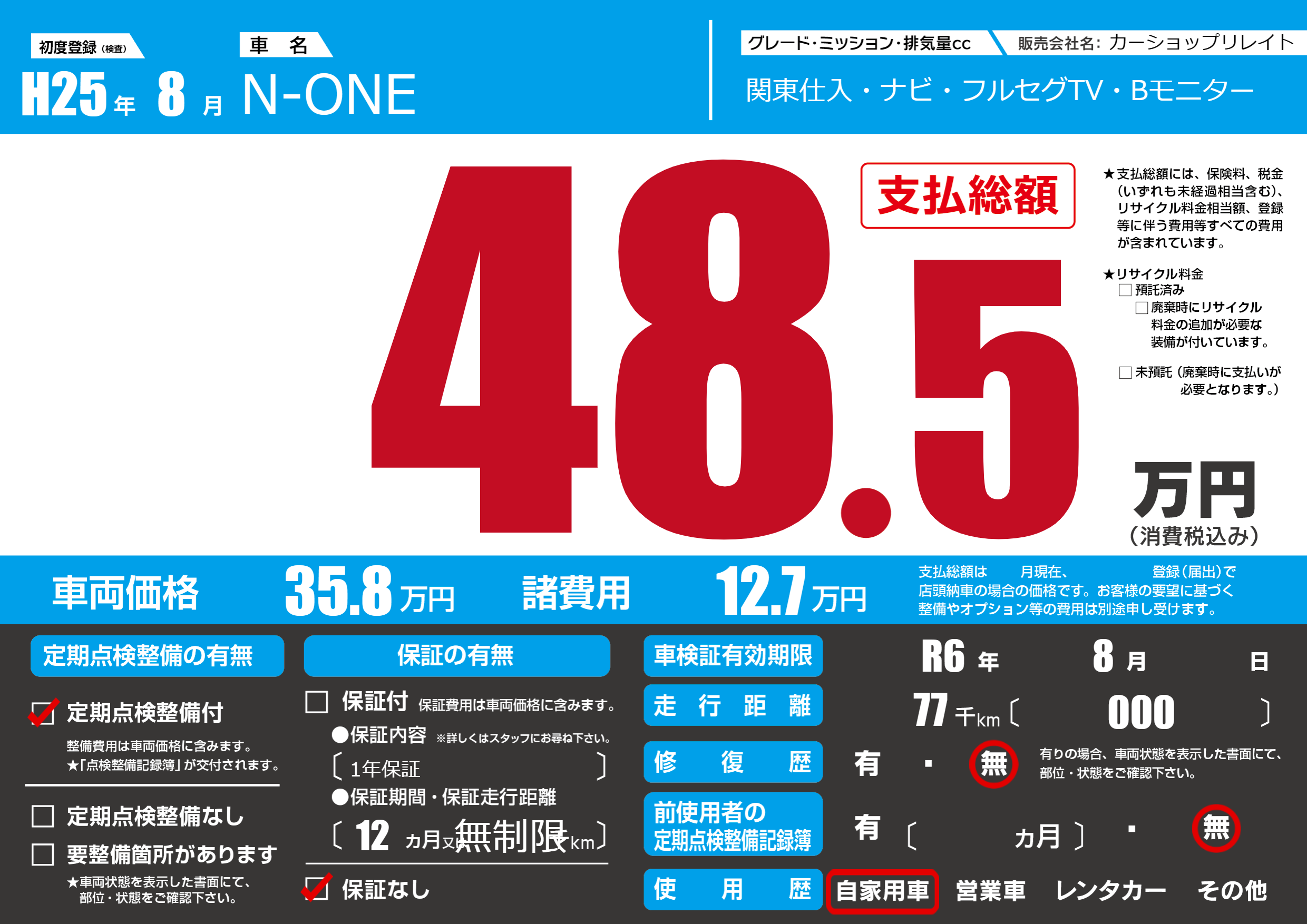 | 車名 | N-ONE | グレード ミッション 排気量 |