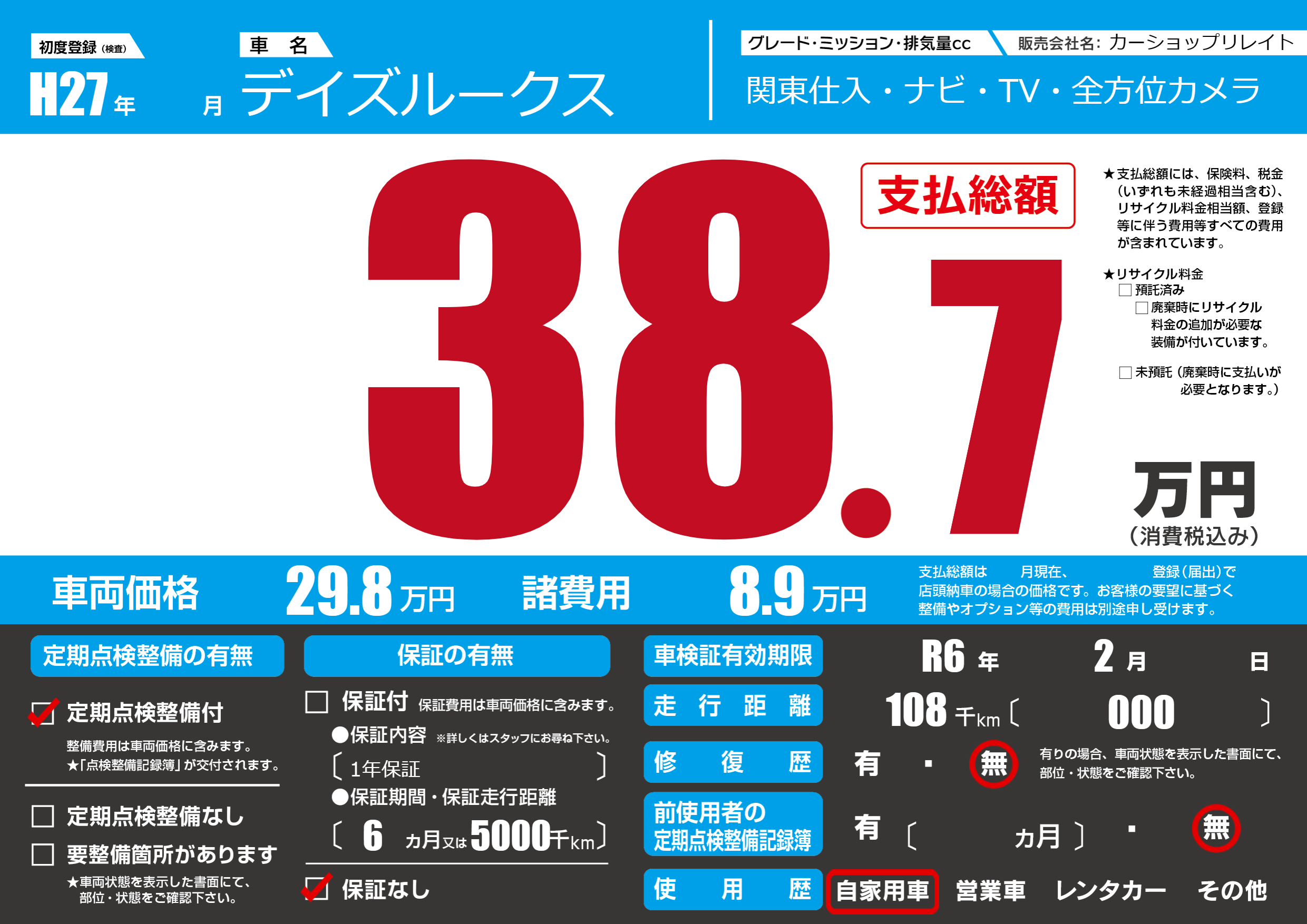 なし | 車検制限 | R6年2月---月 |