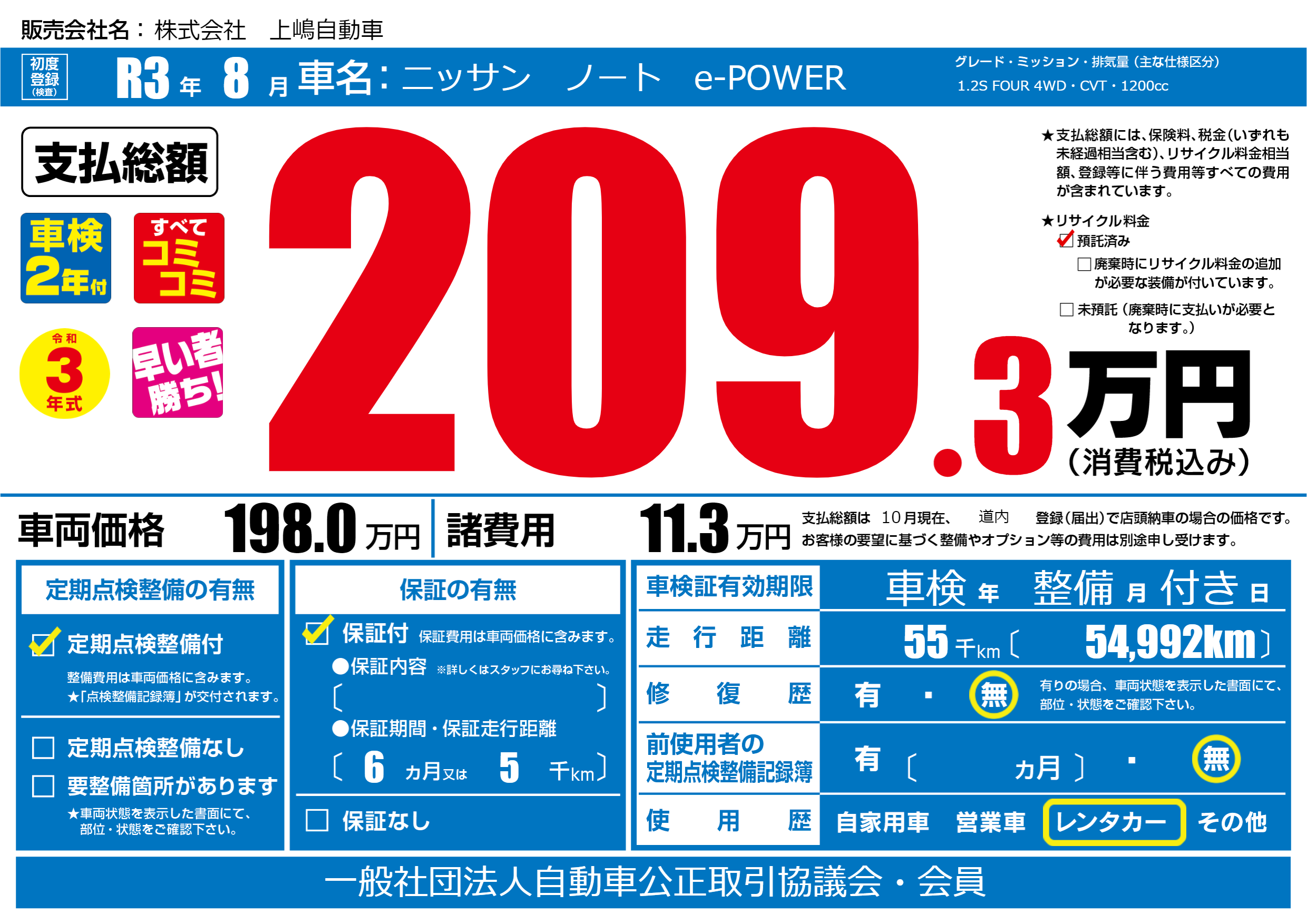 | 車名 | ニッサン ノート e-POWER | グレード ミッション 排気量 |