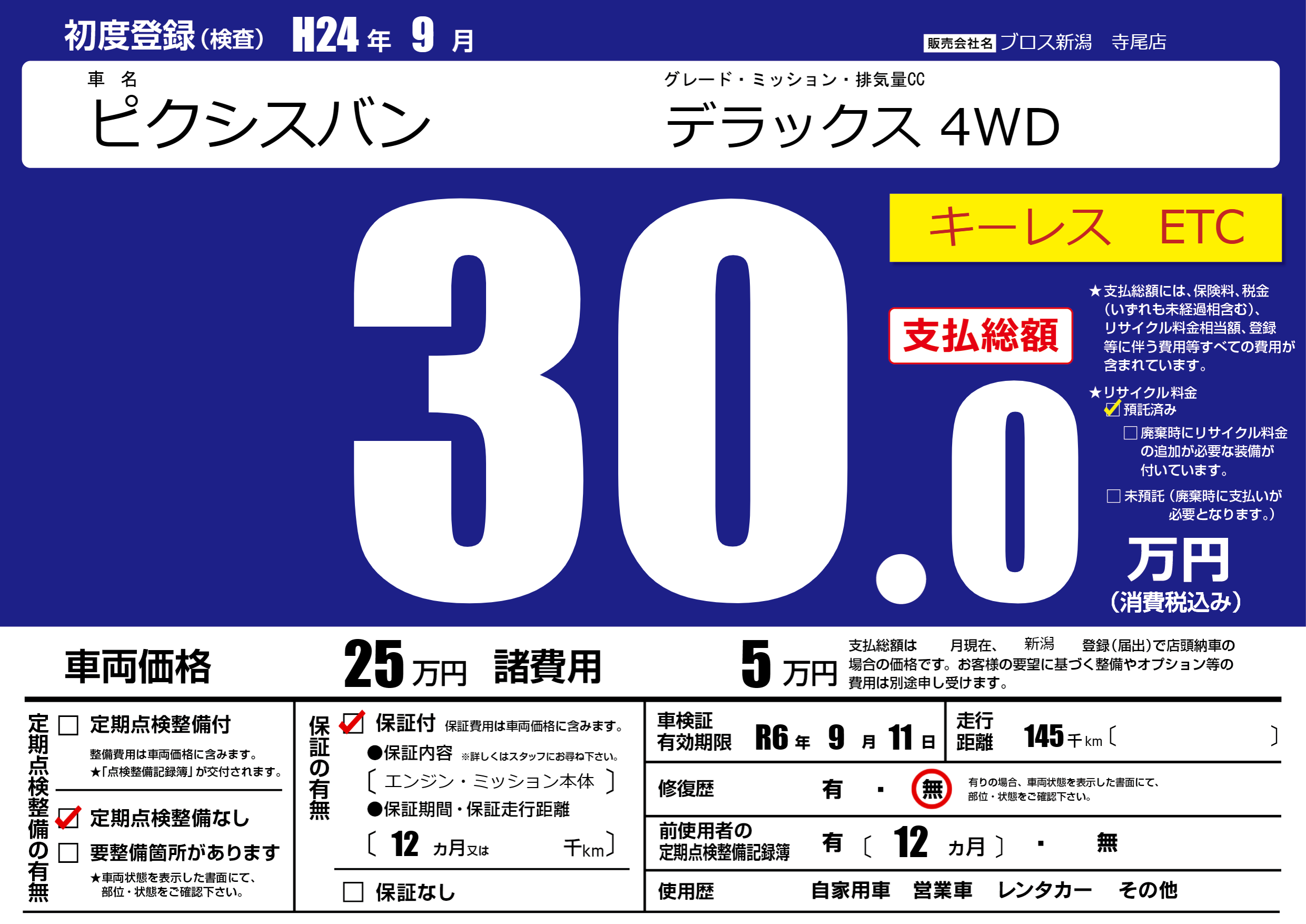 | 走行キロ | 14.5万km | 初年度登録 | H24年9月 |