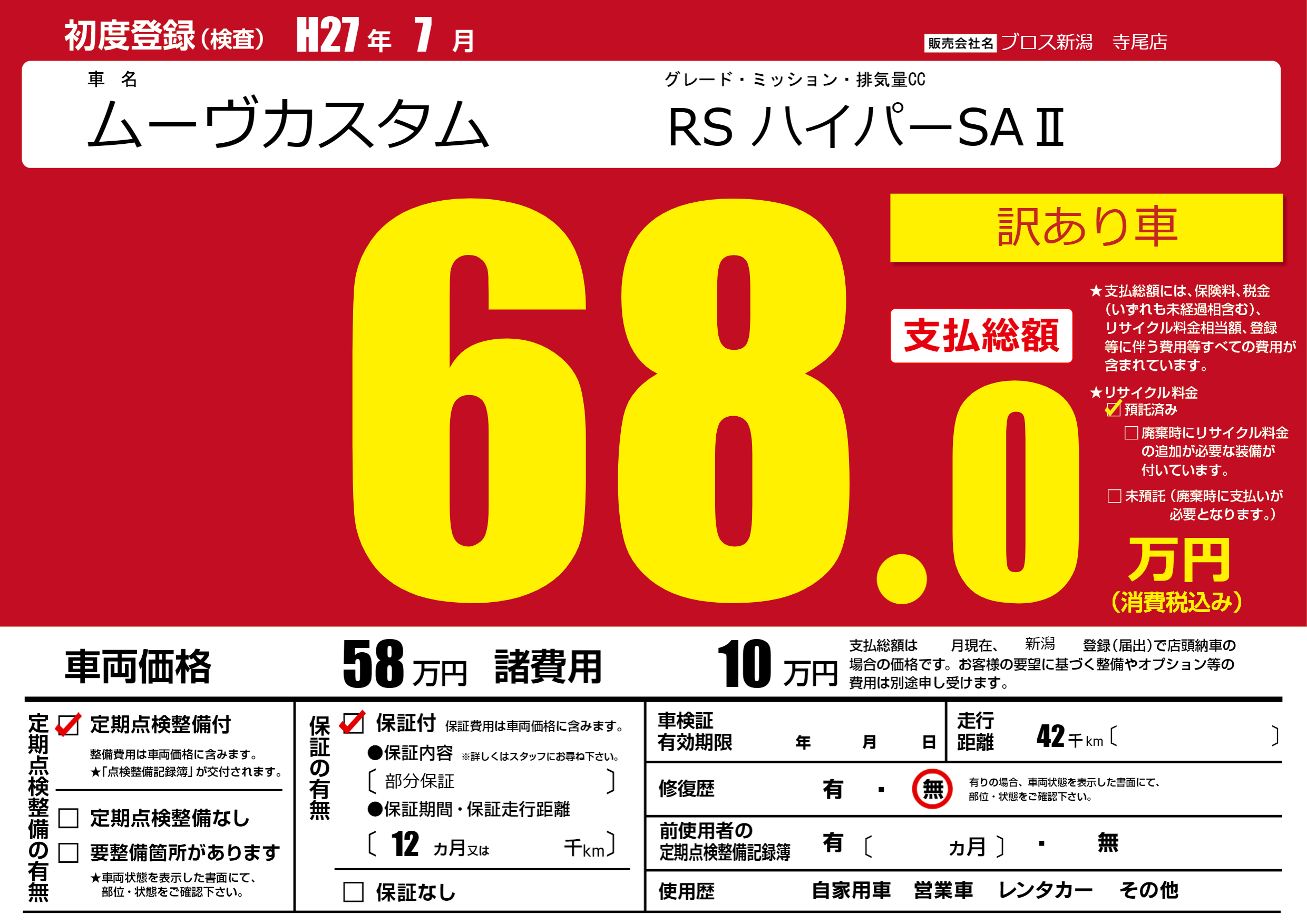 | 走行キロ | 4.2万km | 初年度登録 | H27年7月 |