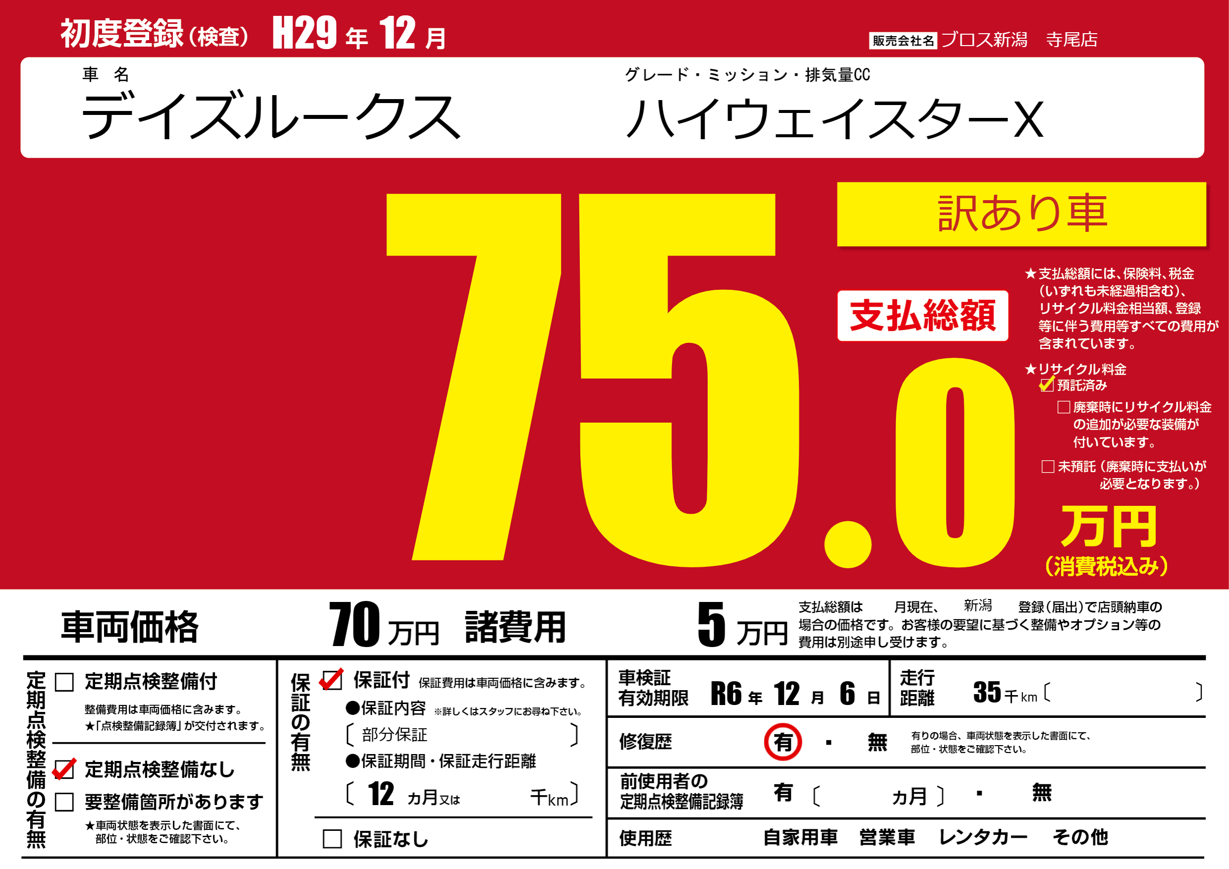 | 走行キロ | 3.5万km | 初年度登録 | H29年12月 |