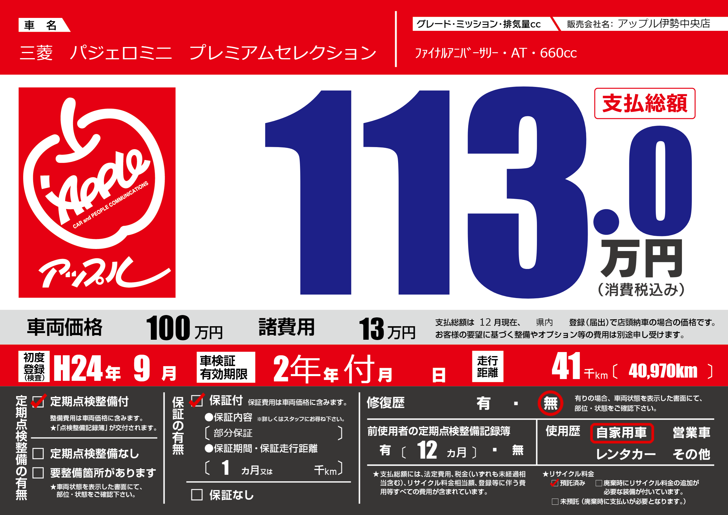 | 車名 | 三菱 パジェロミニ プレミアムセレクション | グレード ミッション 排気量 |
