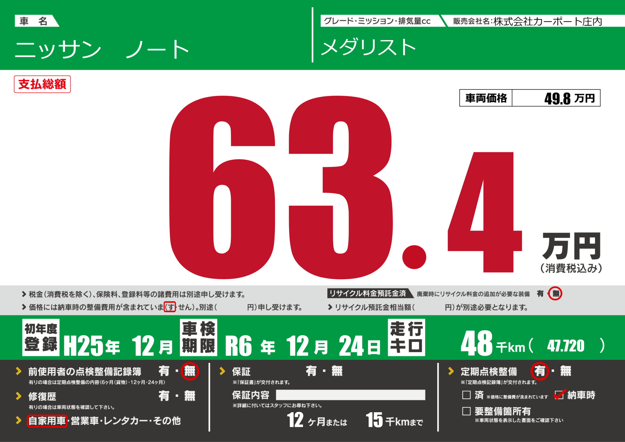 | 定期点検整備 | 定期点検整備あり 納車時あり | ||