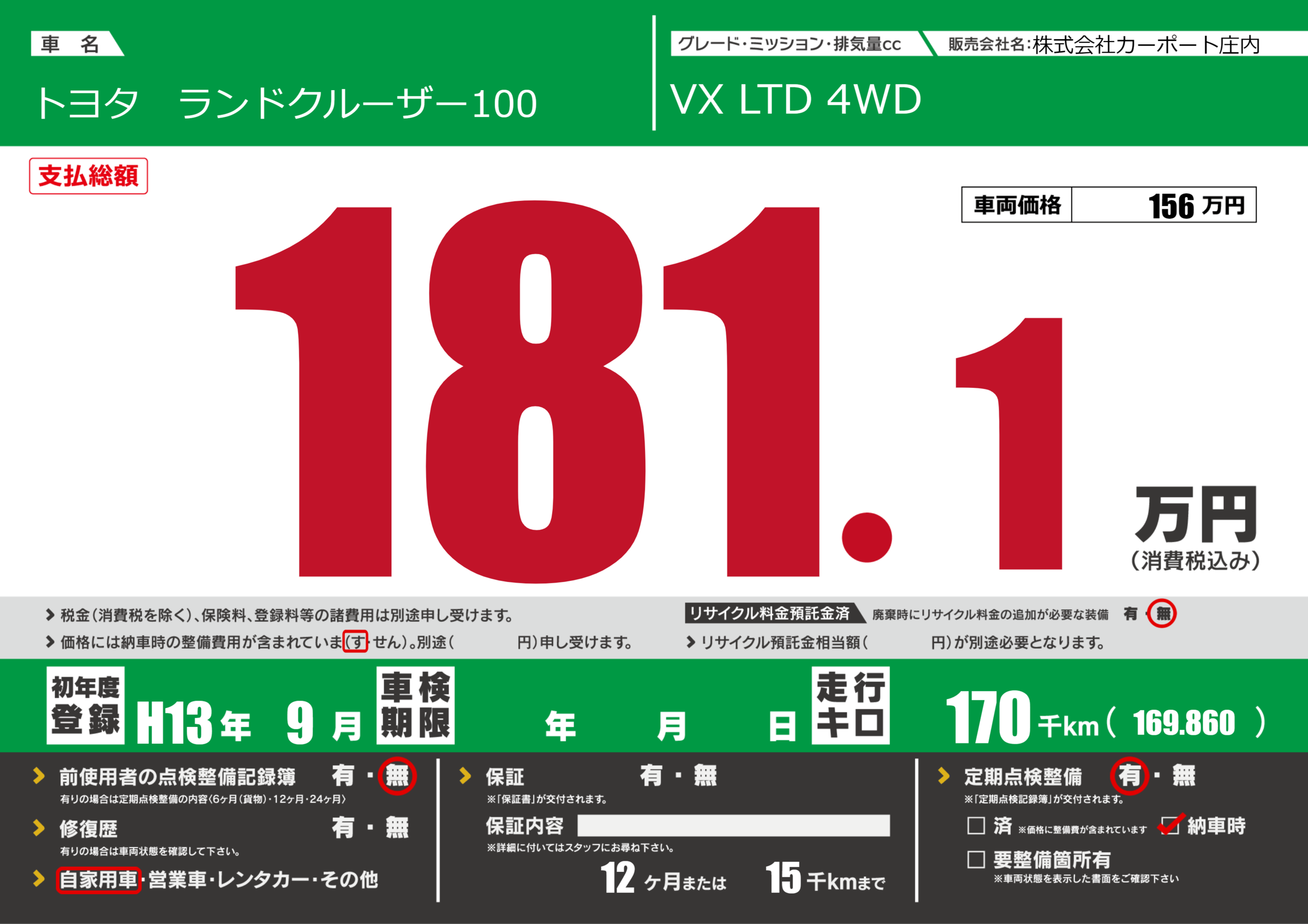 | 車名 | トヨタ ランドクルーザー100 | グレード ミッション 排気量 |