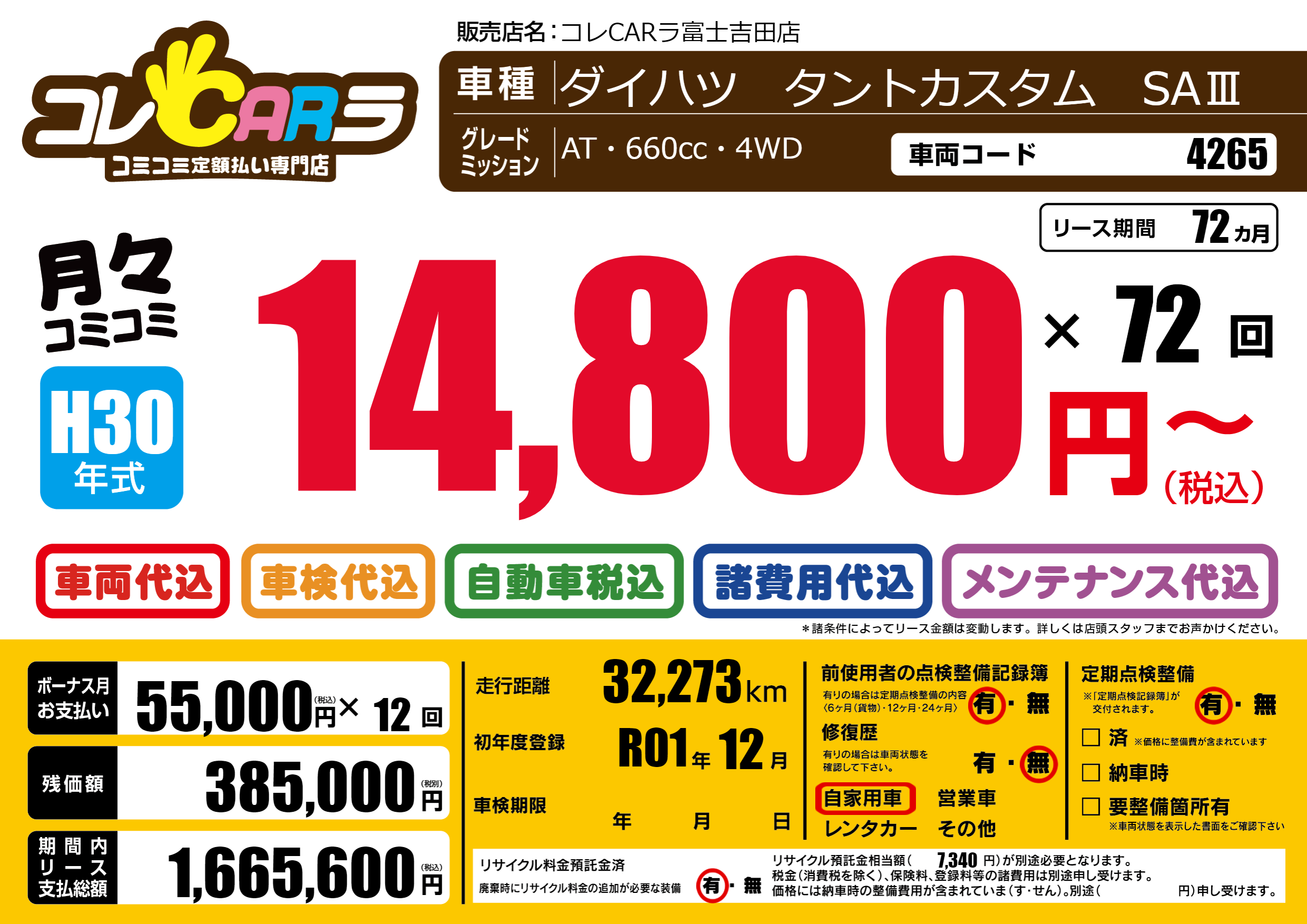 | 走行キロ | 3.2万km | 初年度登録 | R01年12月 |