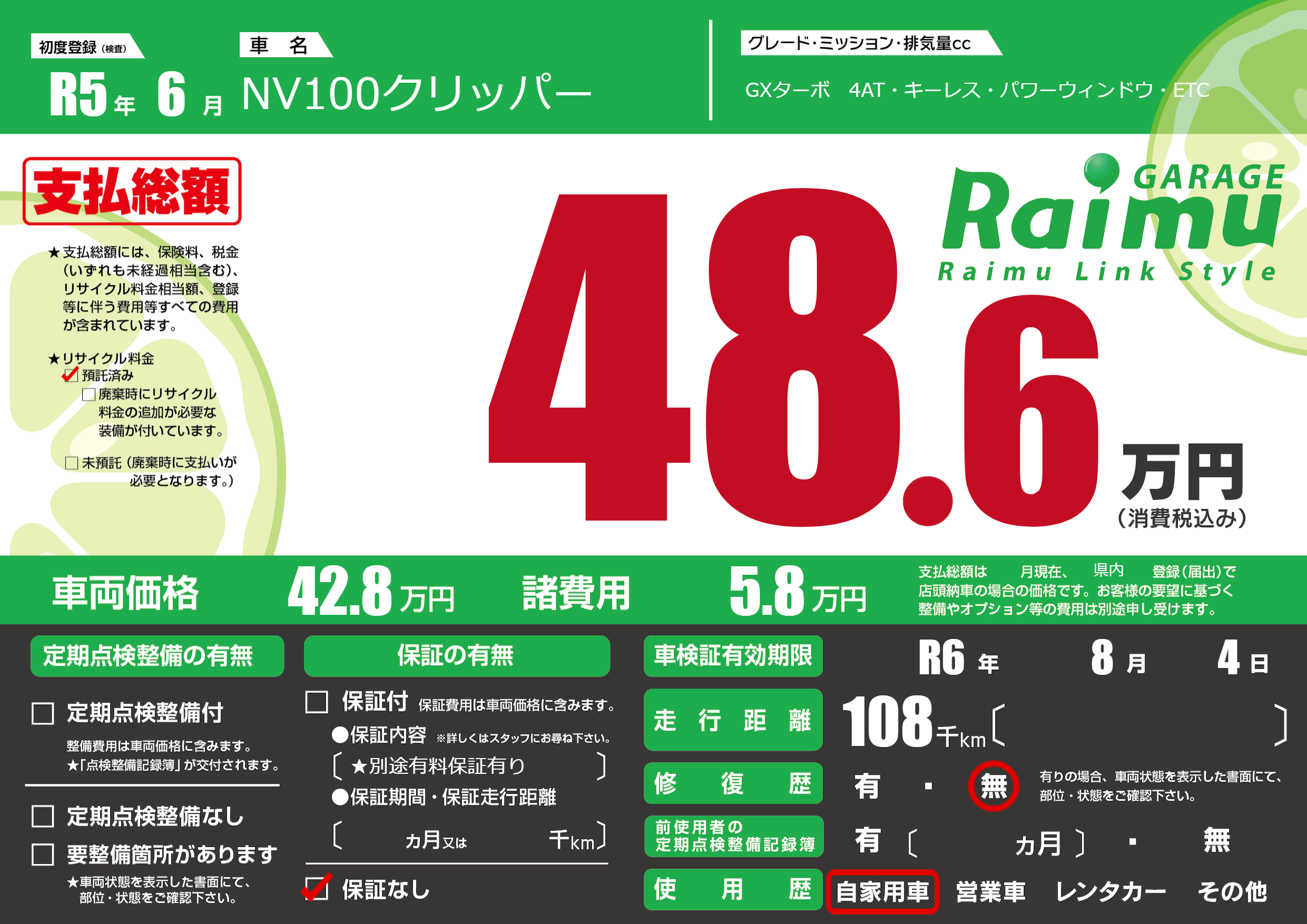 | 走行キロ | 10.8万km | 初年度登録 | R5年6月 |