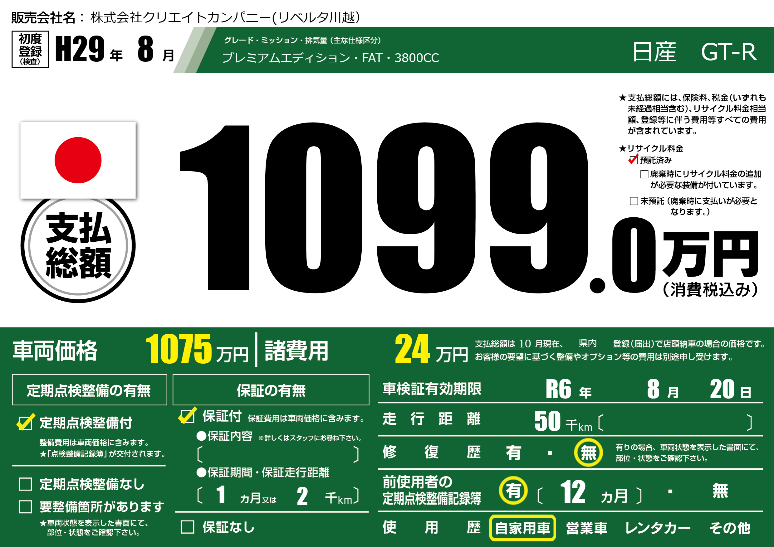| 車名 | 日産 GT-R | グレード ミッション 排気量 |