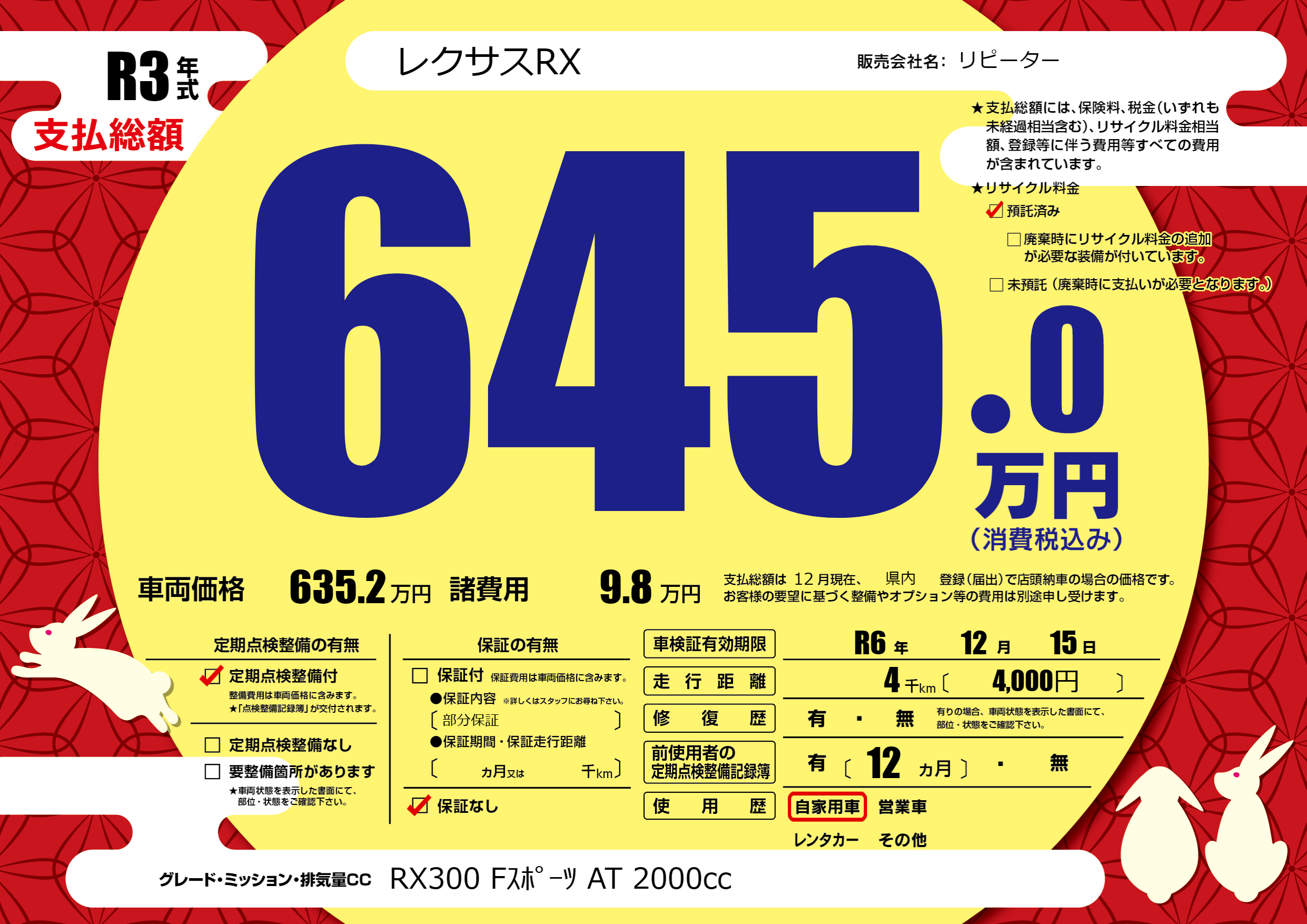 | 車検制限 | R6年 12月 15日 | ||