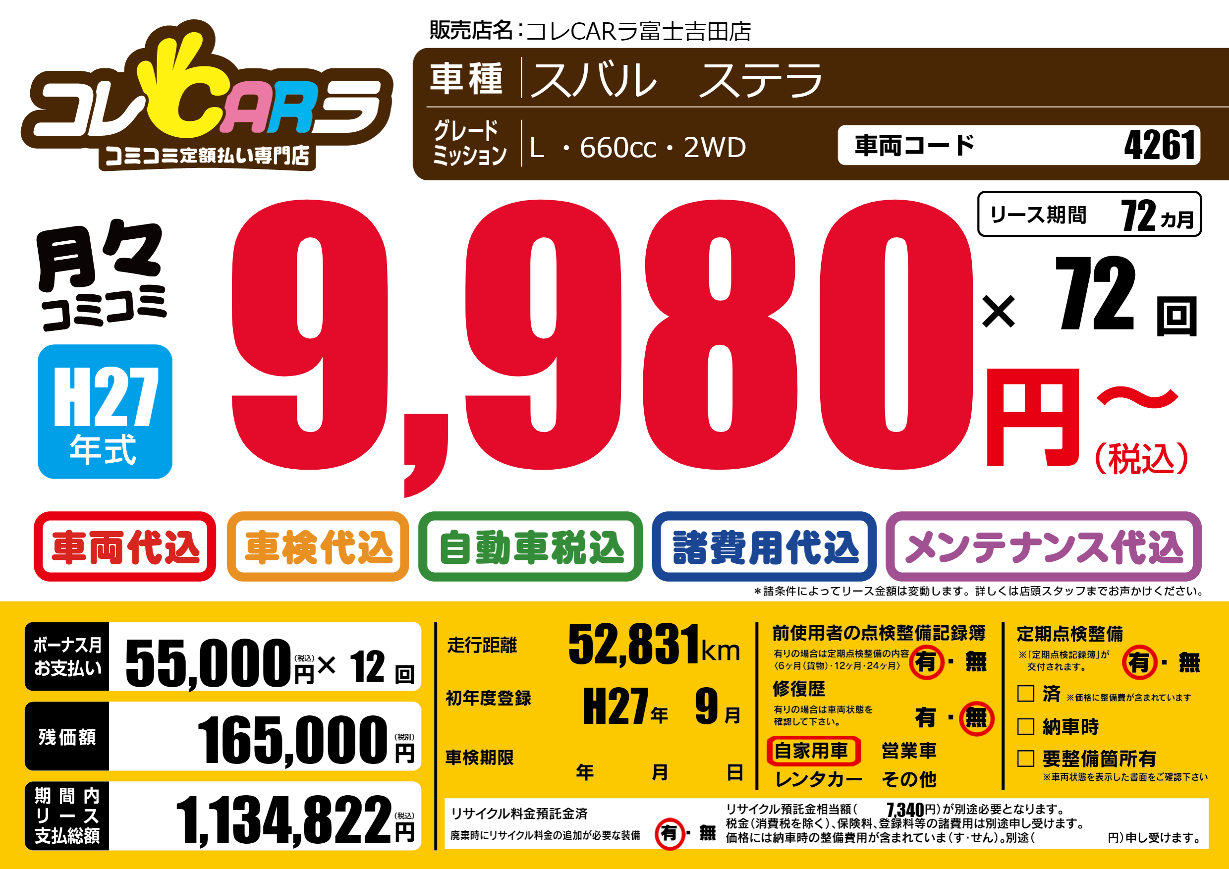 | 車名 | スバル ステラ | グレード ミッション 排気量 |