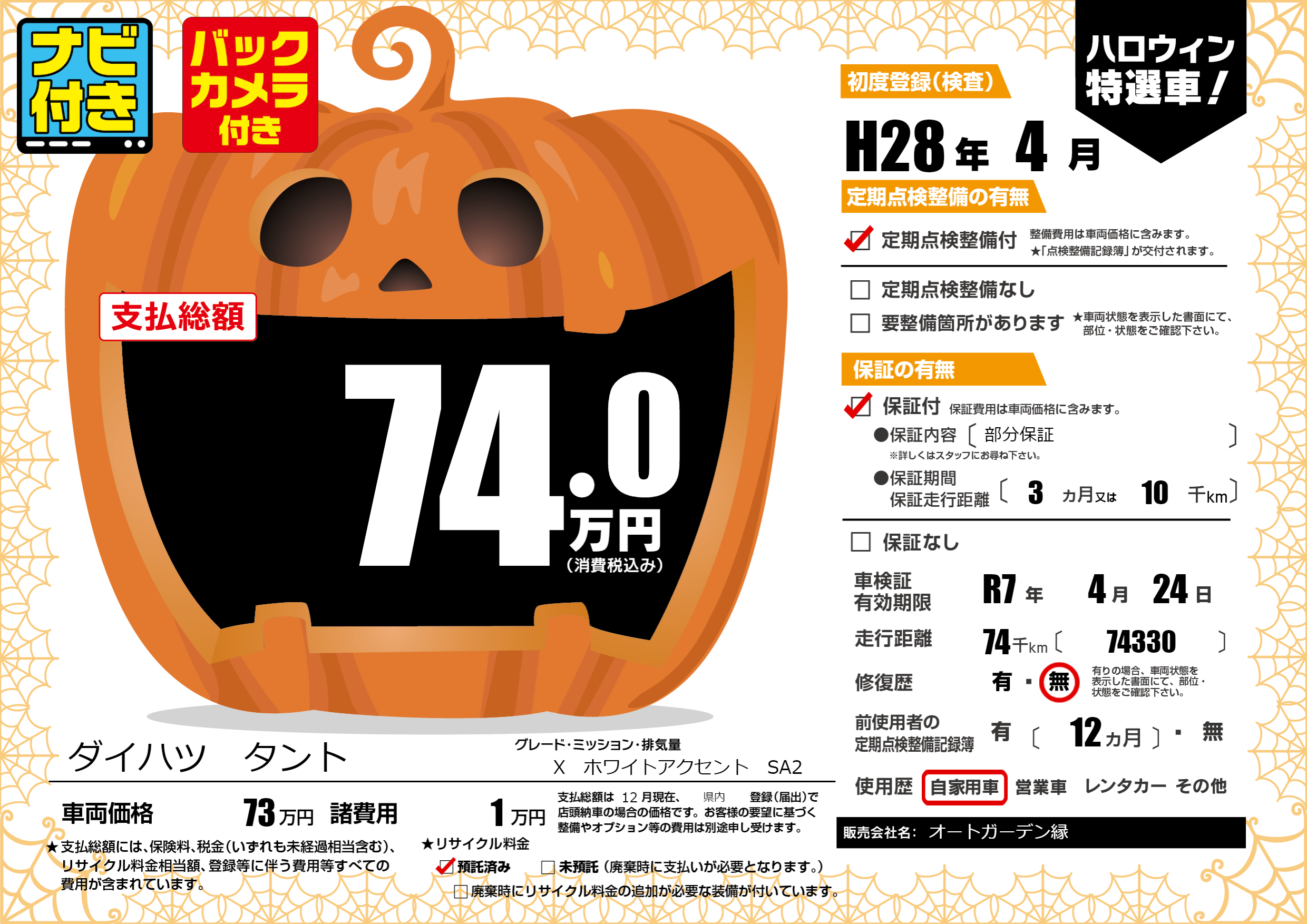 | 走行キロ | 7.4万km | 初年度登録 | H28年4月 |