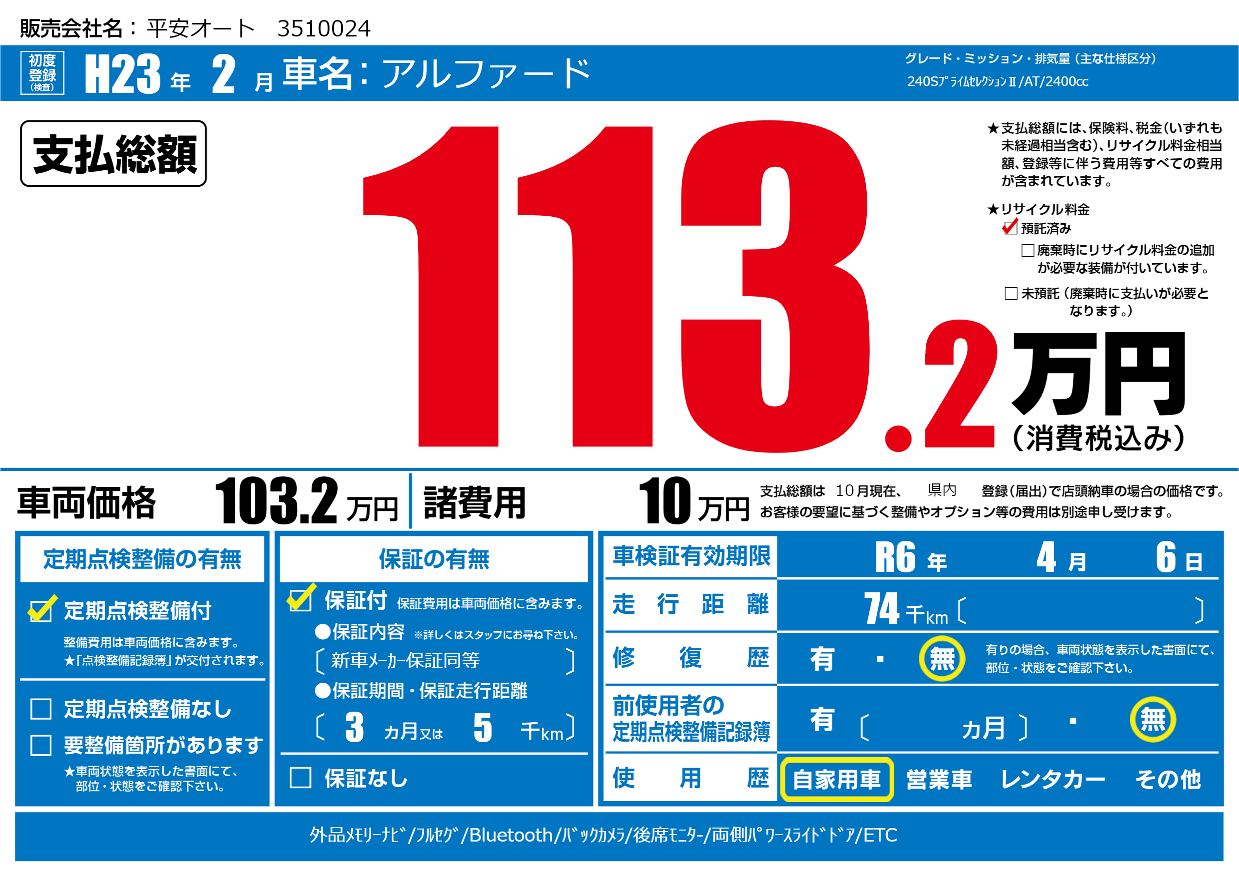 | 走行キロ | 7.4万km | 初年度登録 | H23年2月 |