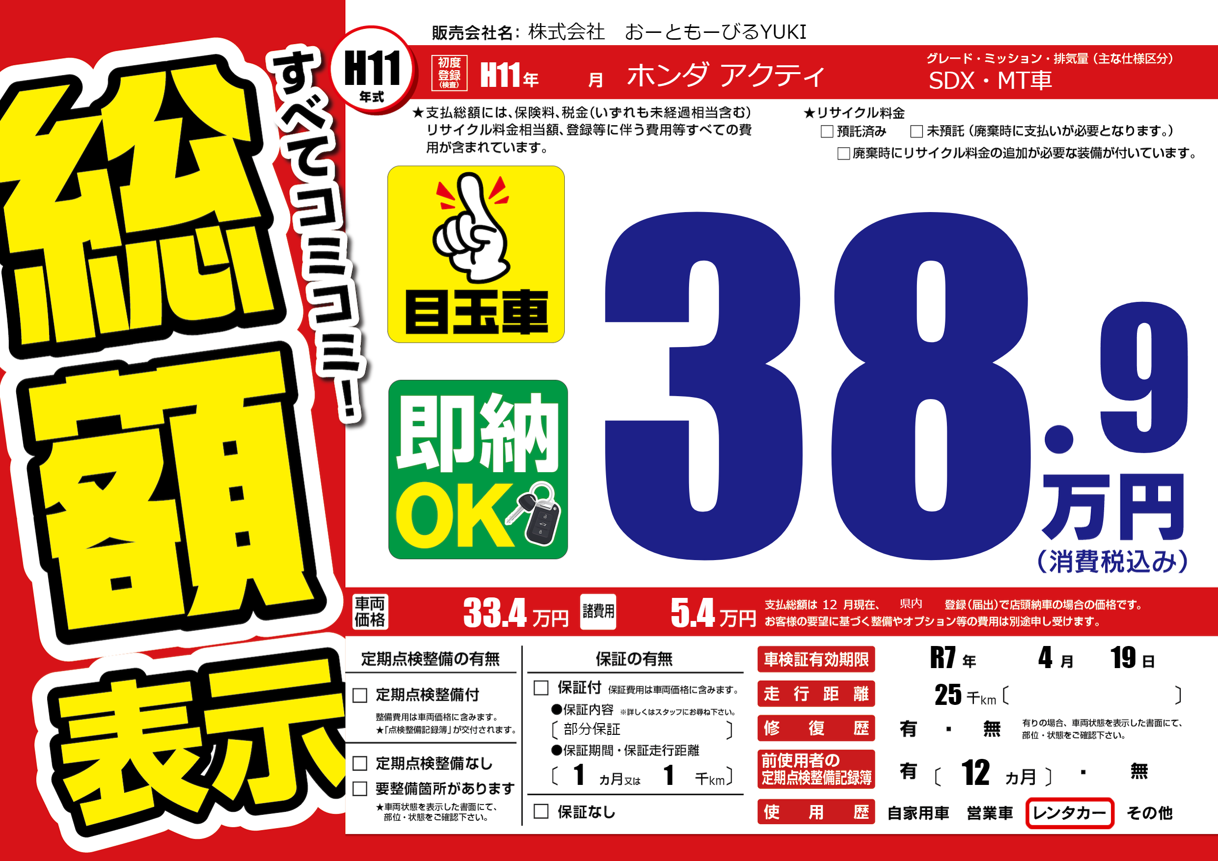 | 車名 | ホンダ アクティ | グレード ミッション 排気量 |