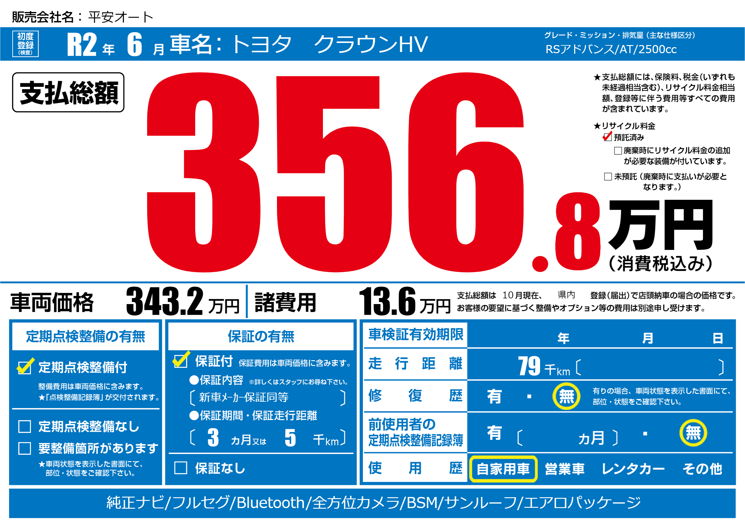 | 車名 | トヨタ クラウンHV | グレード ミッション 排気量 |
