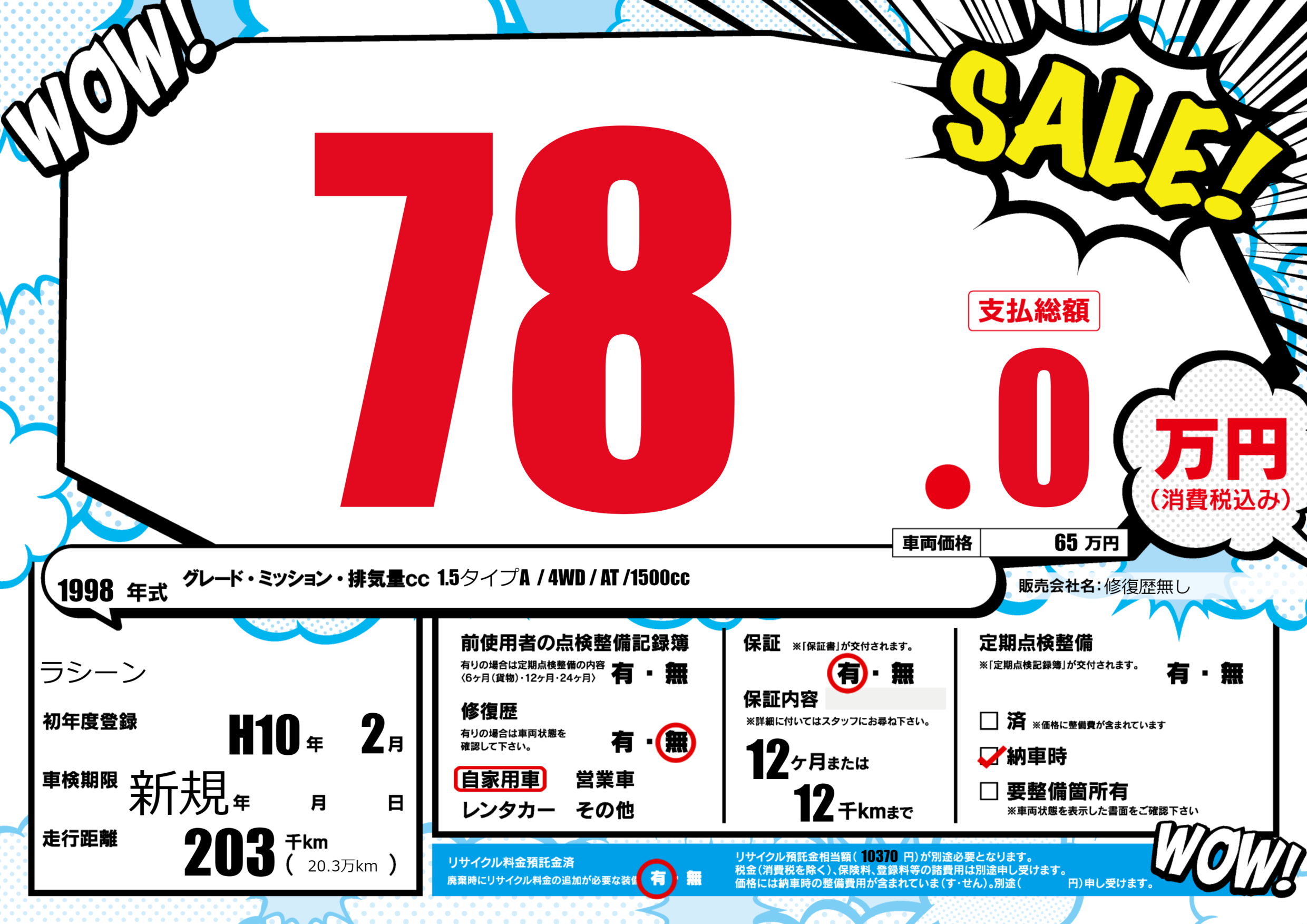 保証付き 保証内容(---) 12ヶ月または(12)千kmまで |