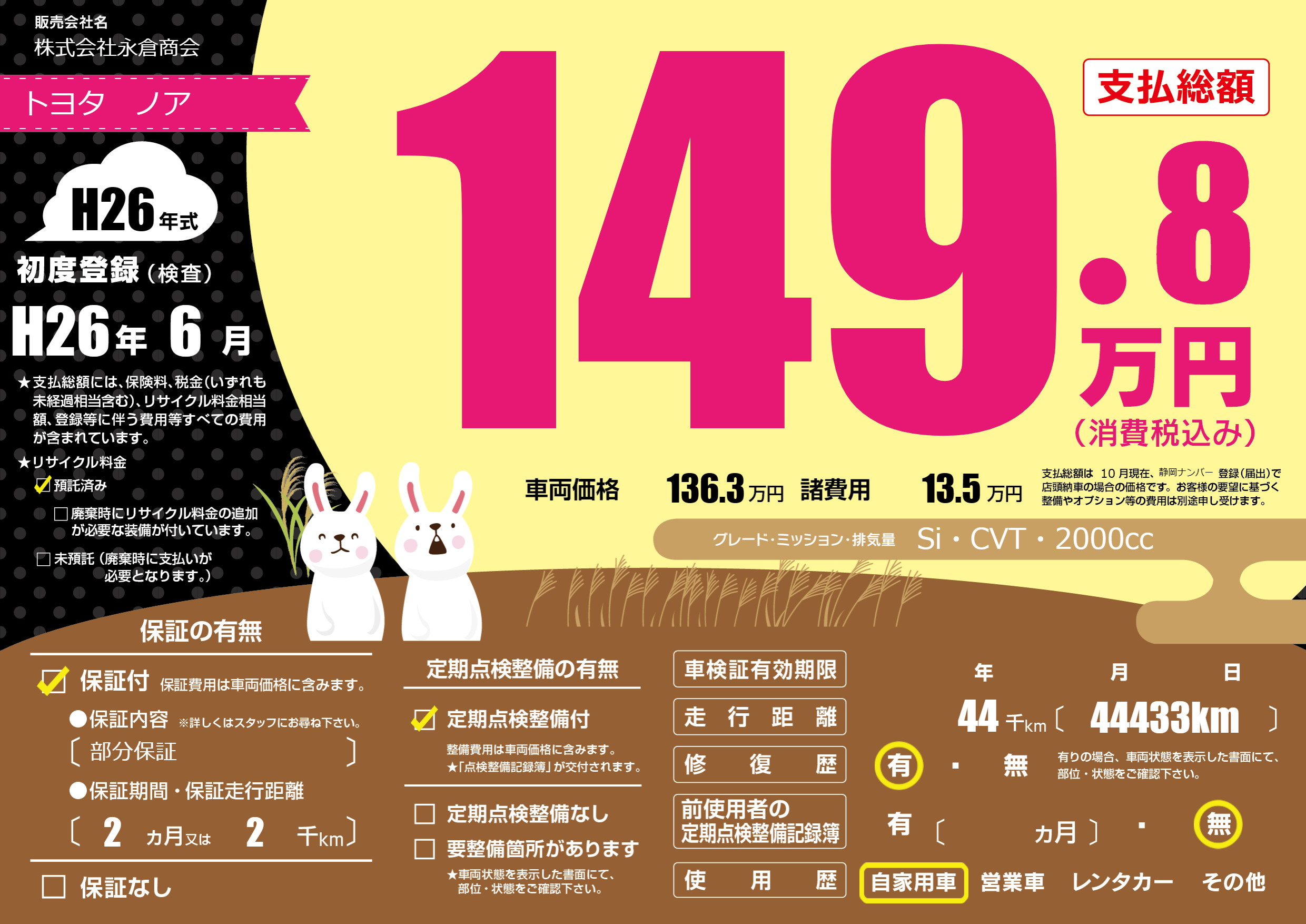 | 走行キロ | 4.4万km | 初年度登録 | H26年6月 |