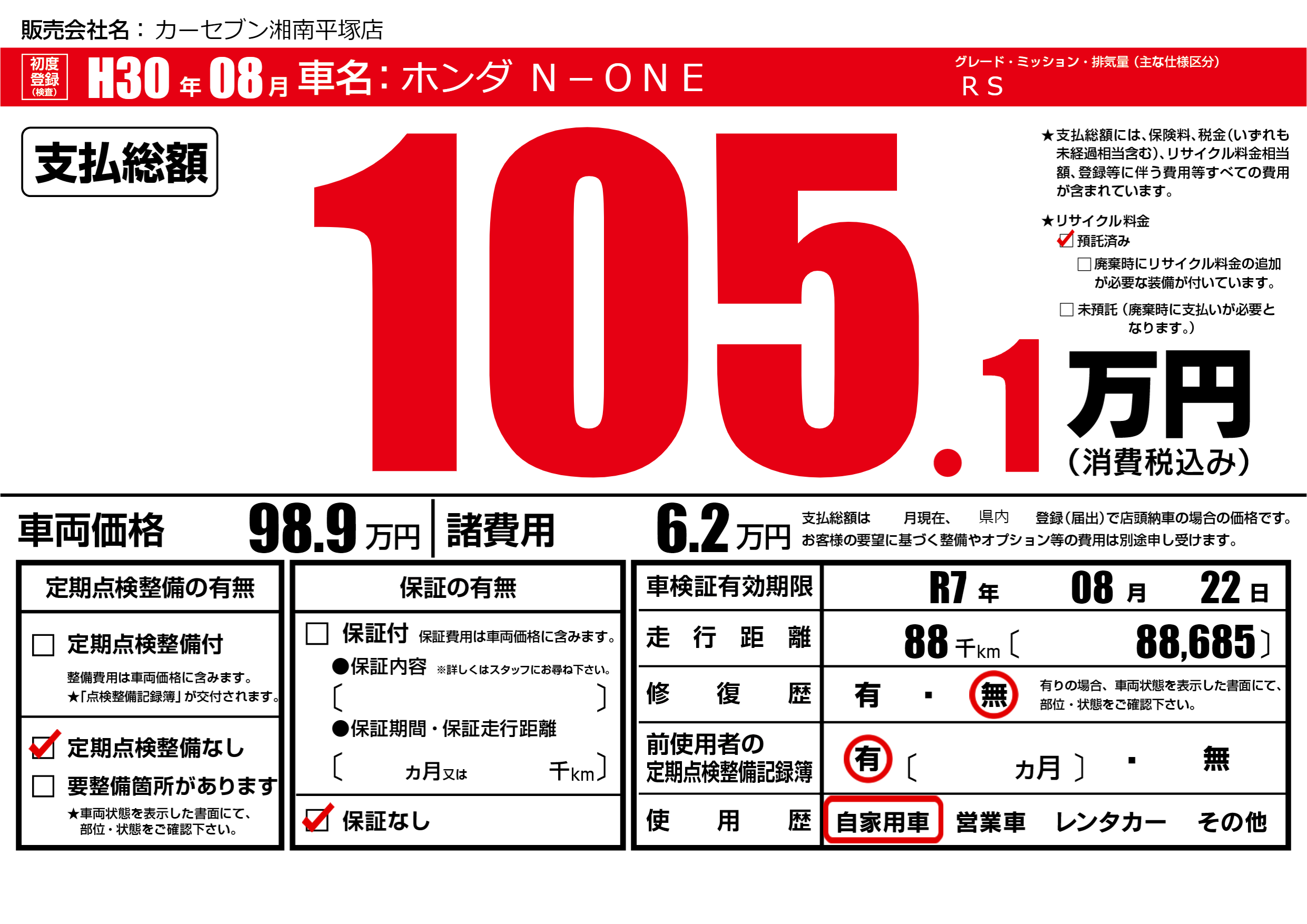 | 車名 | ホンダ N-ONE | グレード ミッション 排気量 |