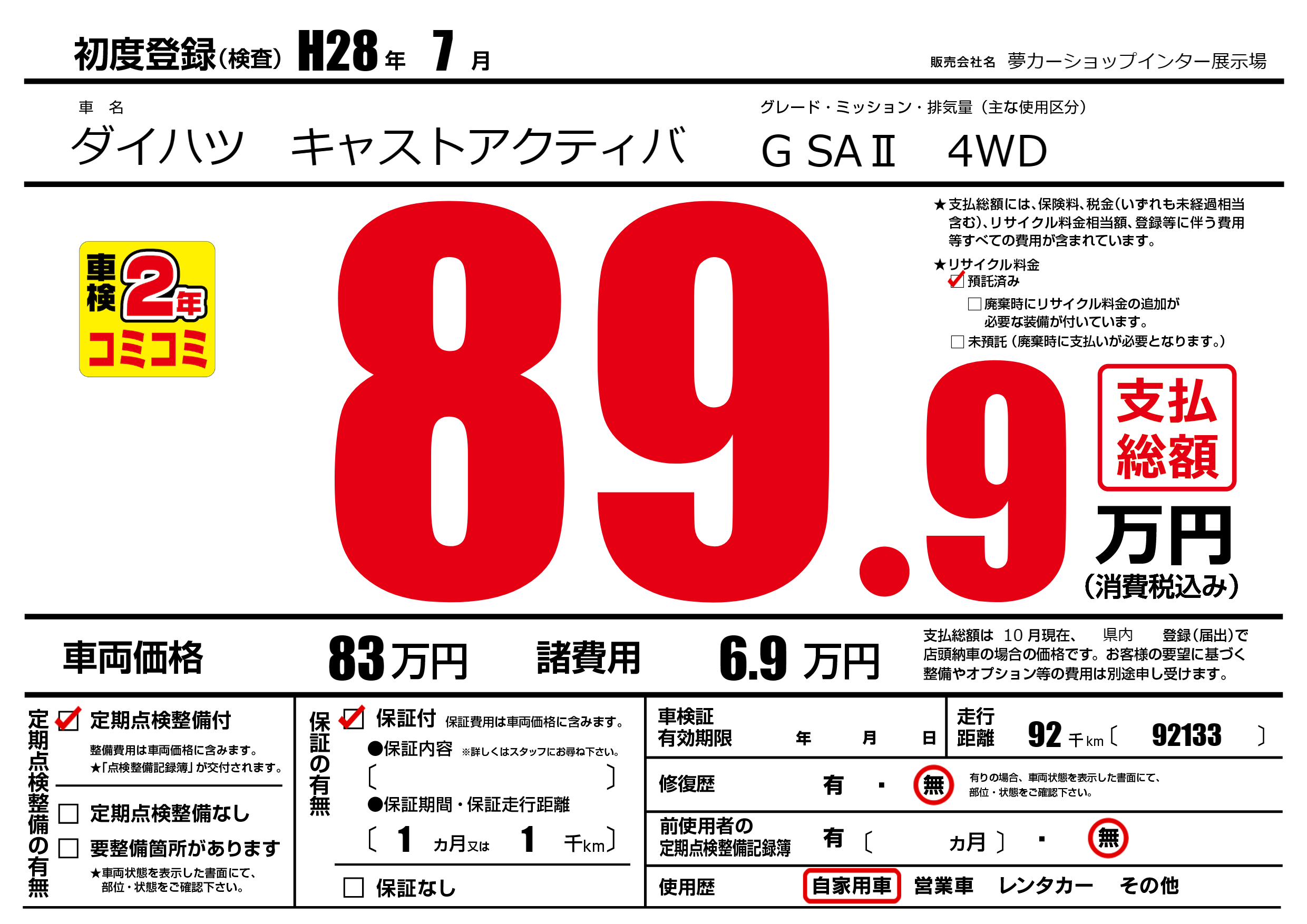| 走行キロ | 9.2万km | 初年度登録 | H28年7月 |