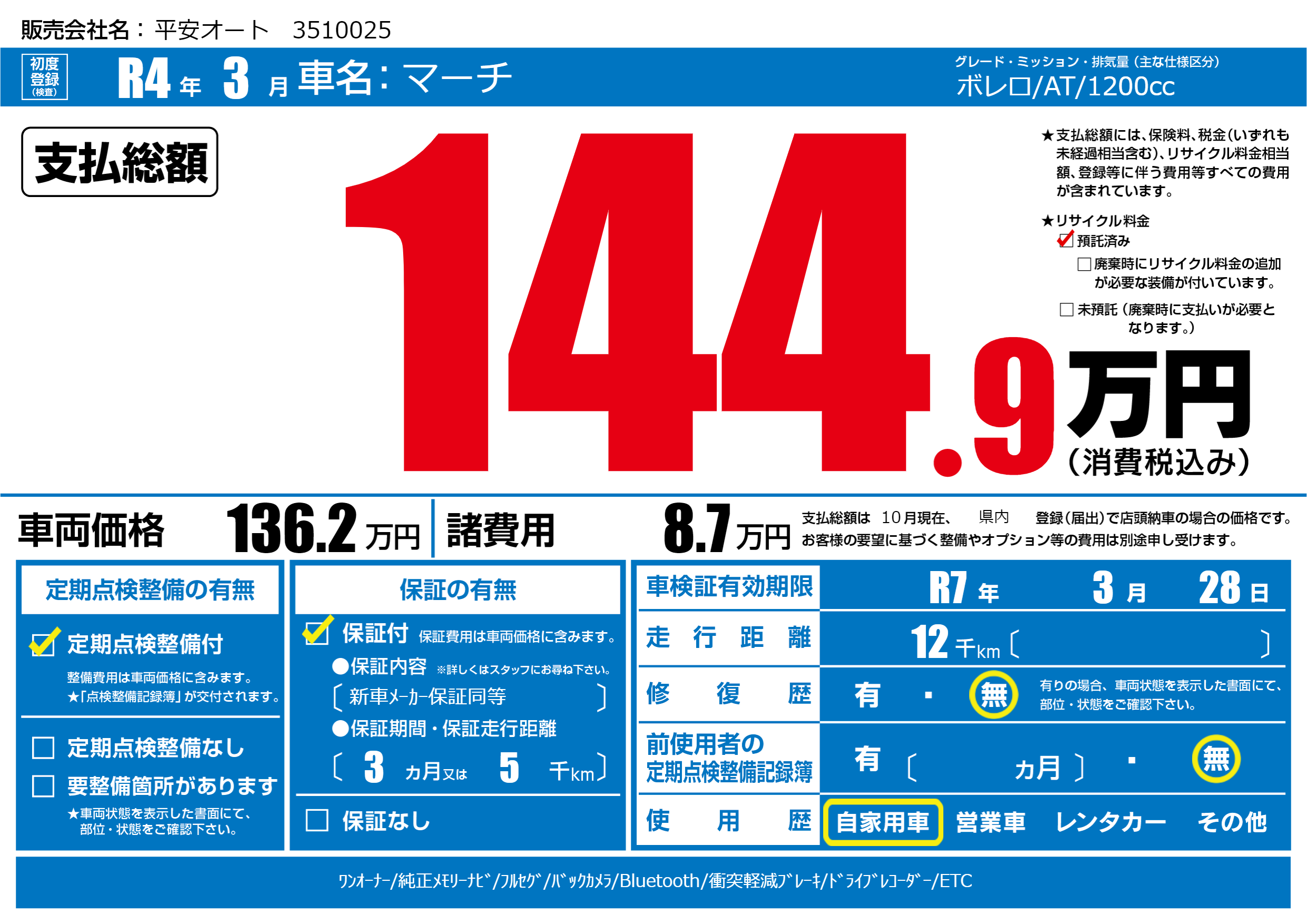 | 車名 | マーチ | グレード ミッション 排気量 |